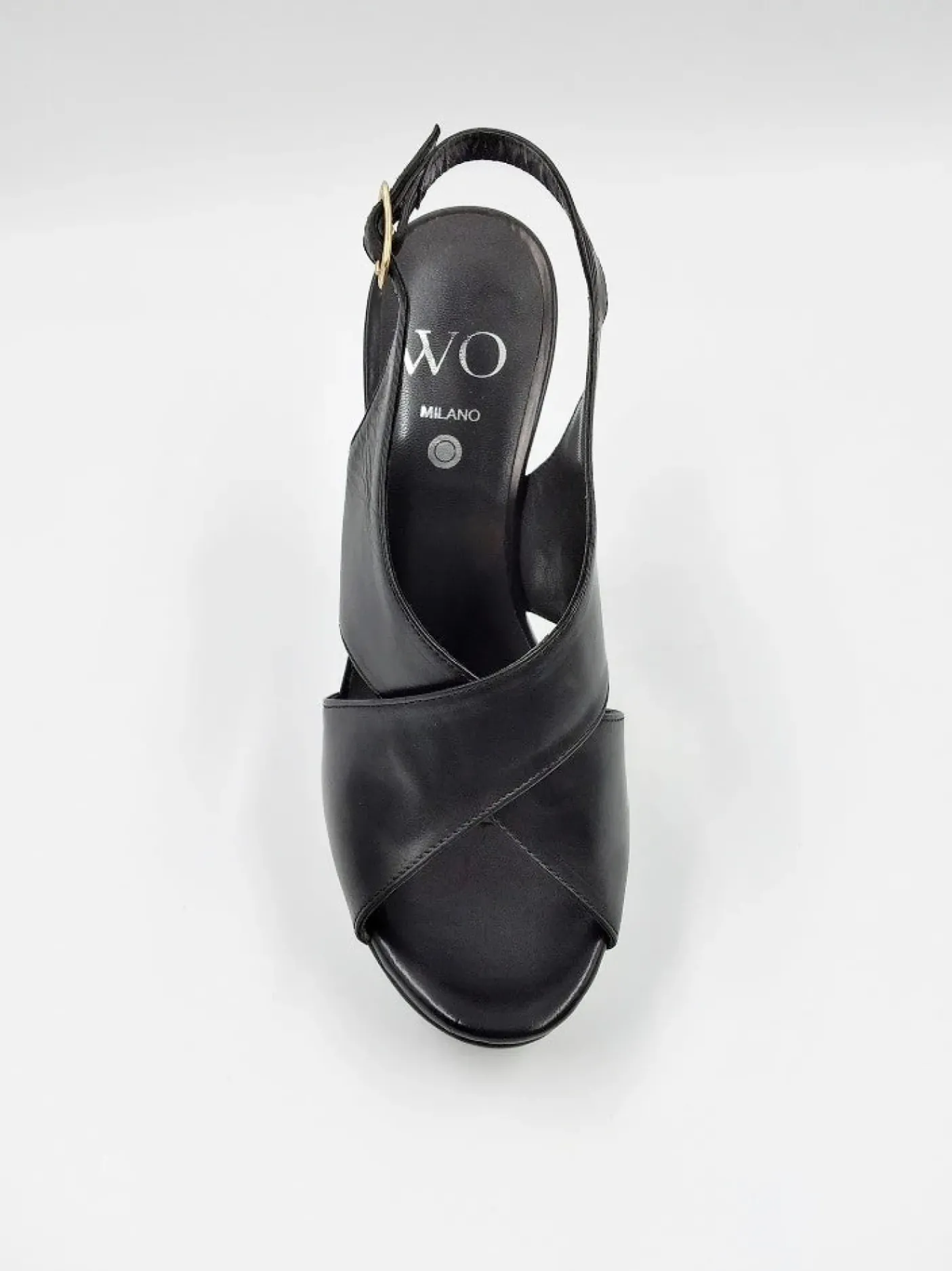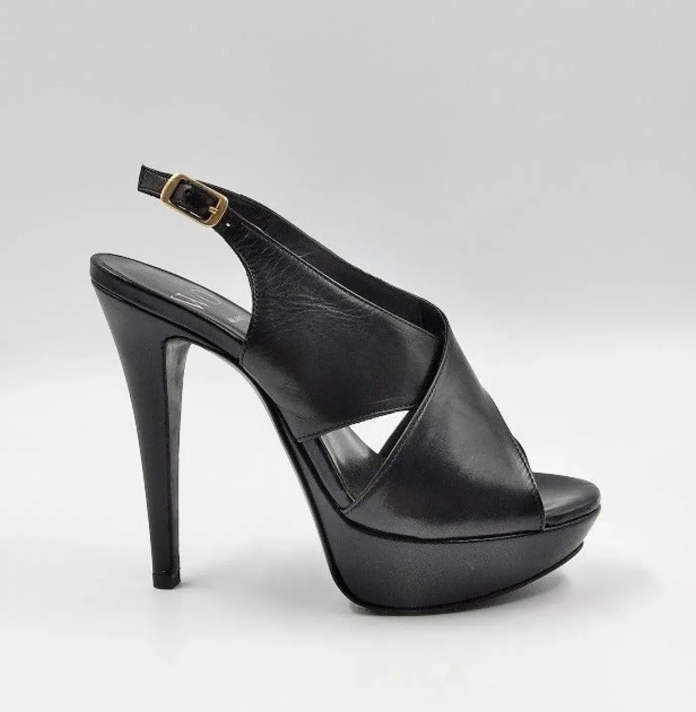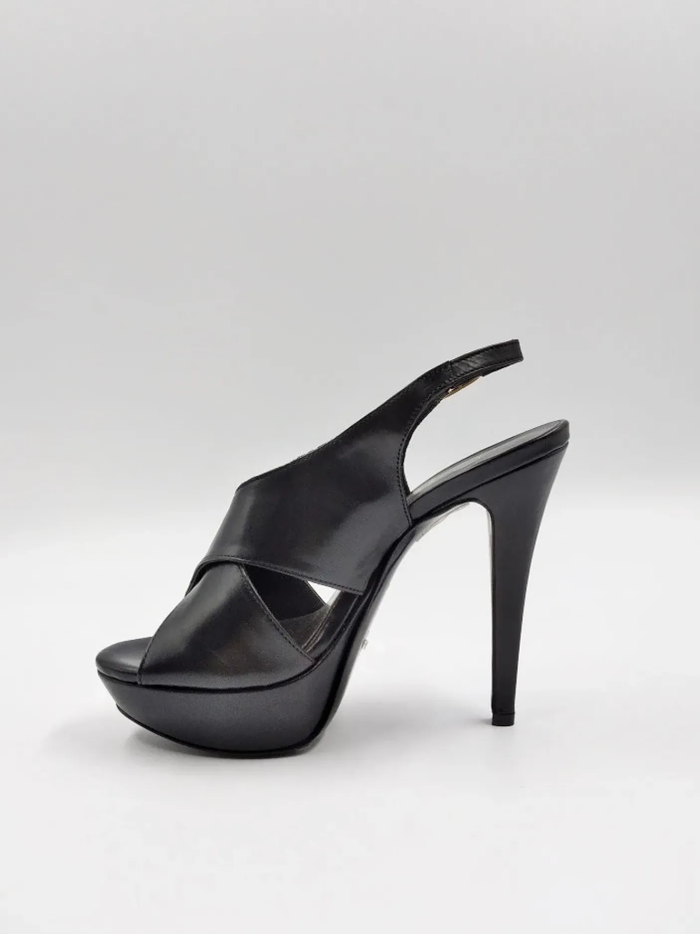 Sandali in pelle nera, con fasce. Chiusura con fibbia alla caviglia.
