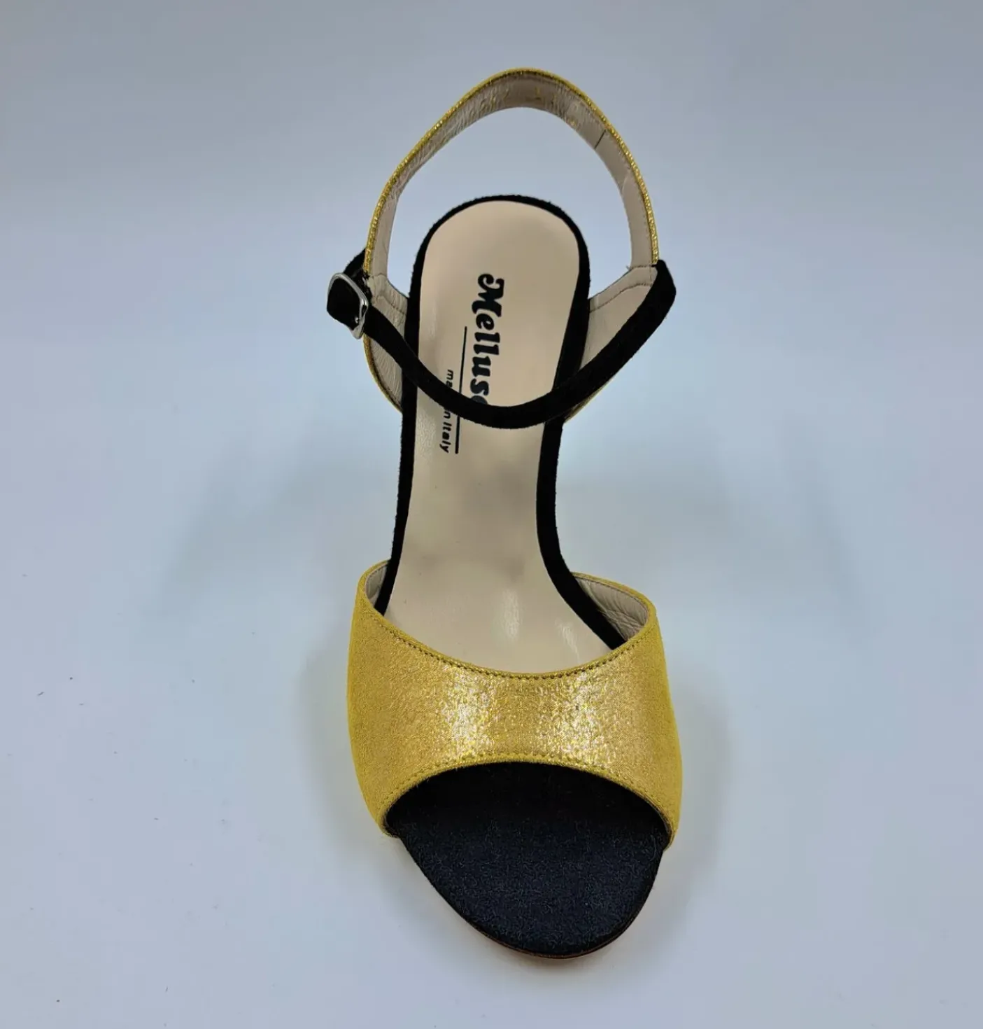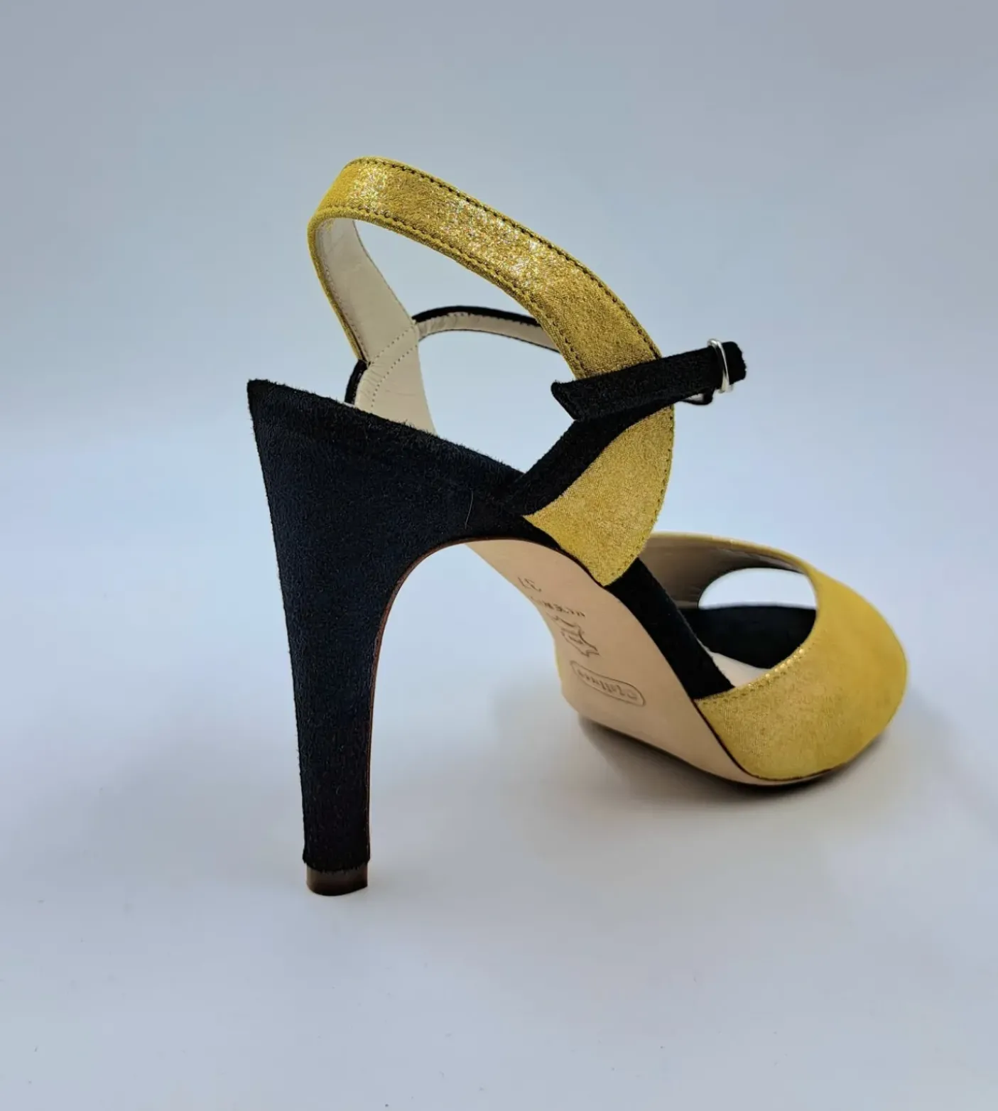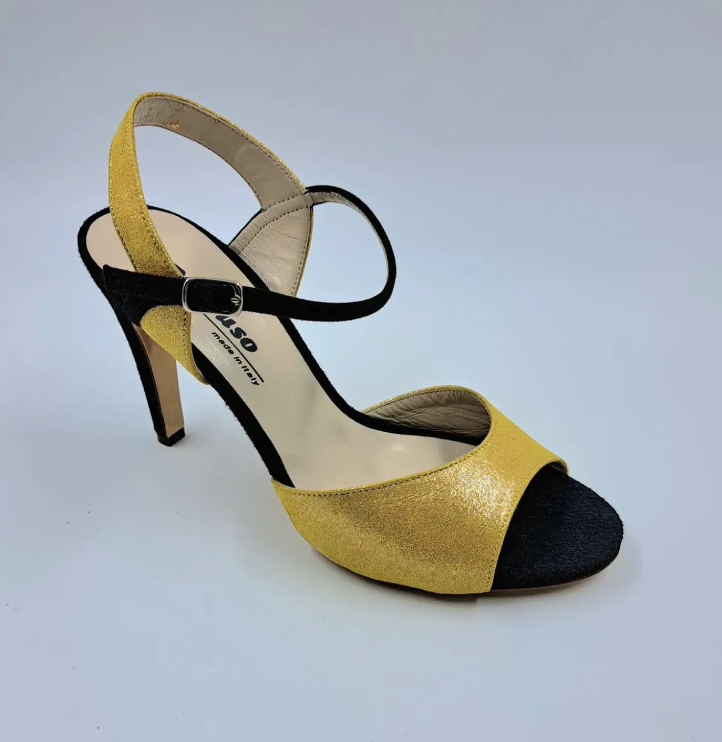 Sandali in tessuto lux, rivestito in vera pelle. Soletta in pelle. Chiusura regolabile in pelle lucida.Tacco 10cm