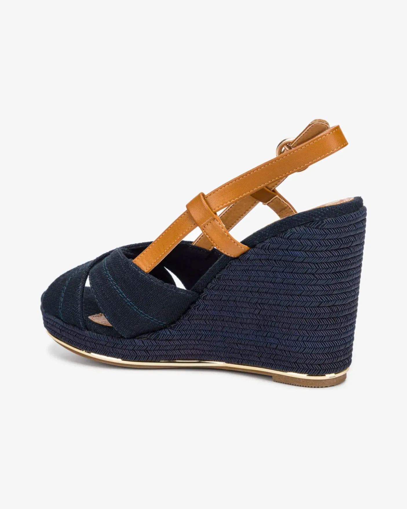 Sandali in tessuto ed ecopelle. Sottopiede in pelle. Chiusura regolabile. Tacco rivestito in tessuto 10cm