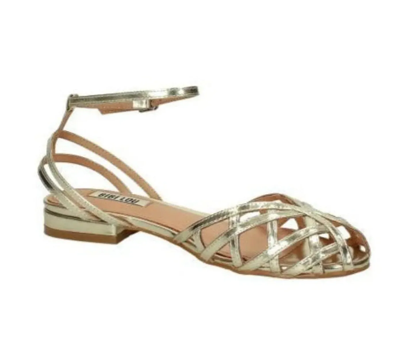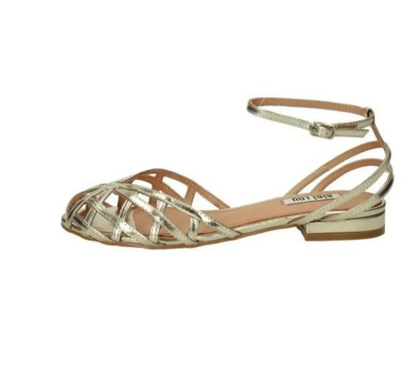 Sandali in pelle con fascette oro. Spuntato. Laccio alla caviglia con chiusura regolabile. Sottopiede in pelle. Tacco 2cm
