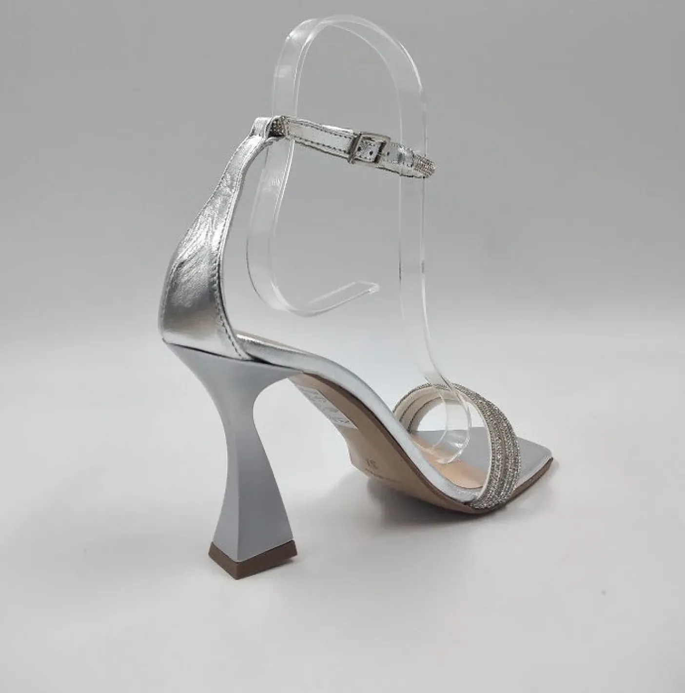 Sandali in pelle laminata argento con fasce tessuto strass. Chiusura alla caviglia con tessuto strass e fibbia. Tacco10cm