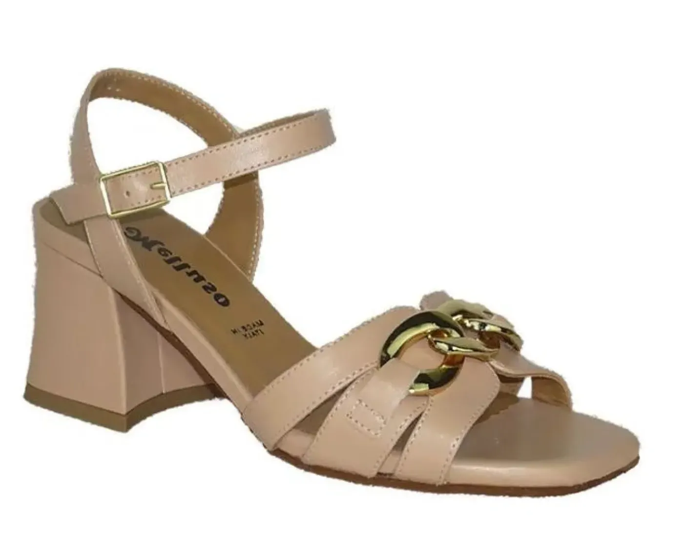 Sandalo in vera pelle con soletta in pelle. Chiusura regolabile alla caviglia. Dettaglio catena metallica color oro. Tacco squadrato 6cm