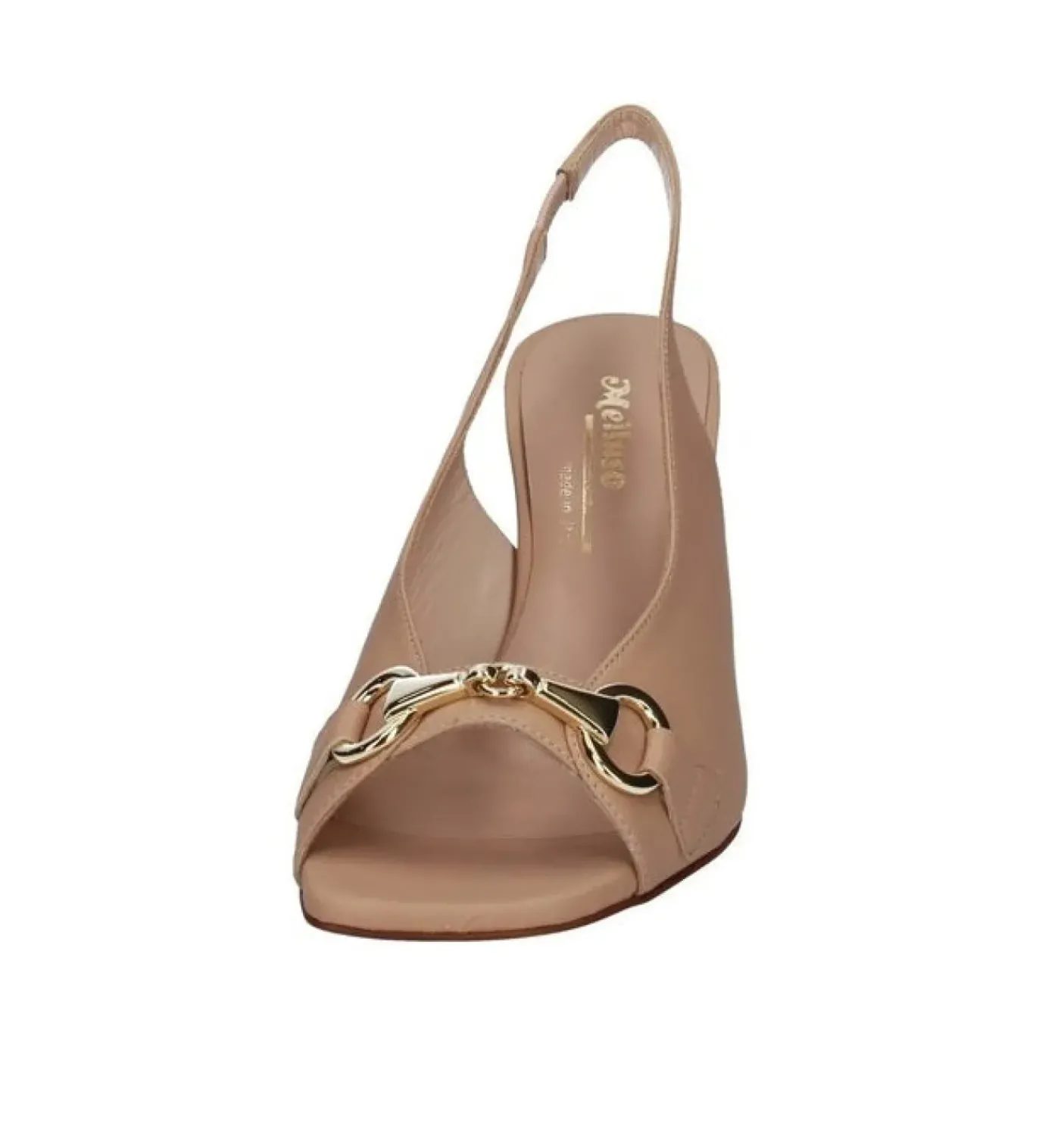 Sandali in vera pelle nude, rivestito internamente in pelle. Fibbia metallica oro sul davanti. Elastico laterale. Tacco 7cm