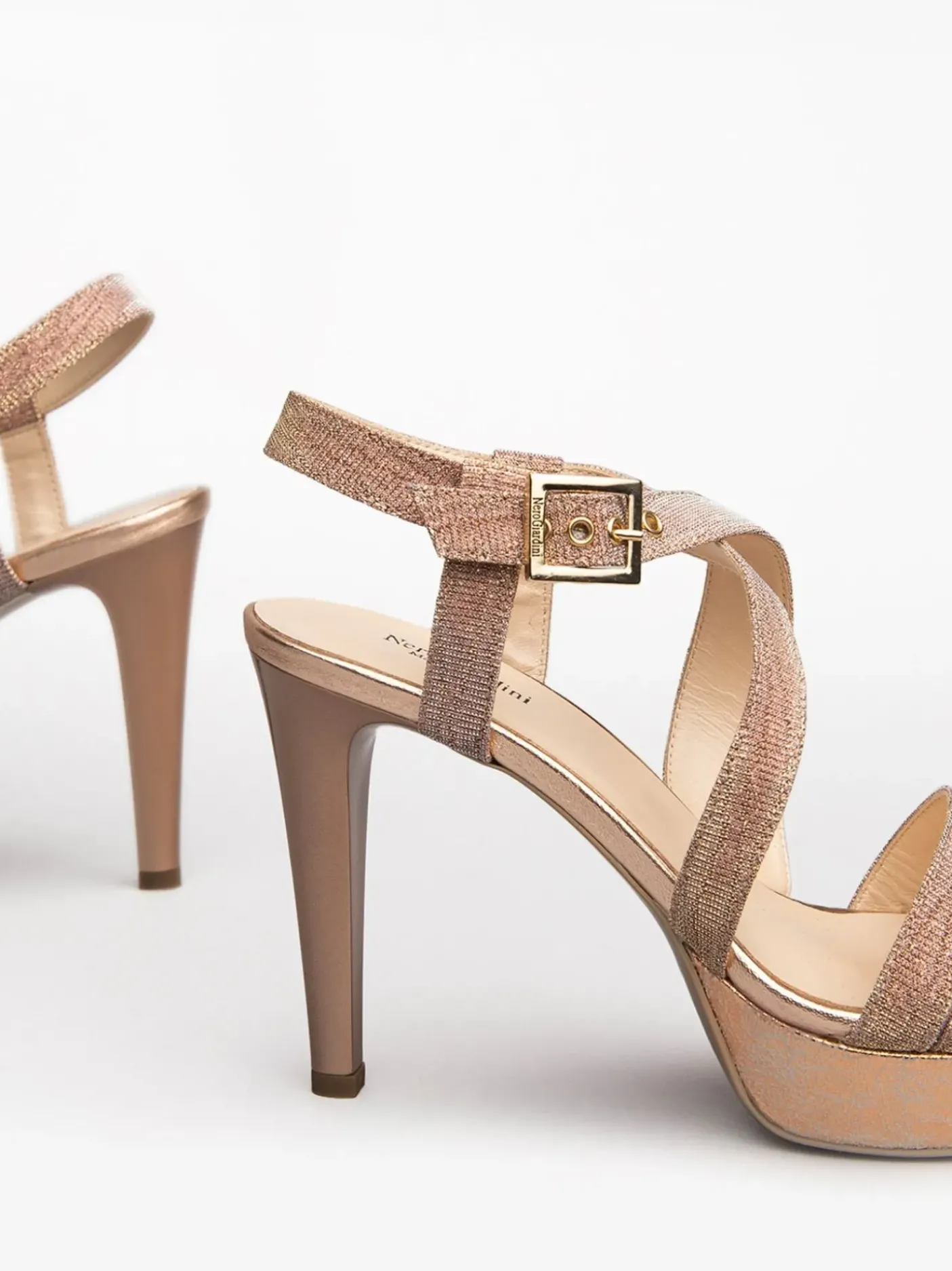 Sandali in tessuto lux rivestito internamente in pelle. Soletta in pelle. Doppia fascia sul piede. Chiusura con fibbia regolabile. Fondo gomma. Tacco 10cm