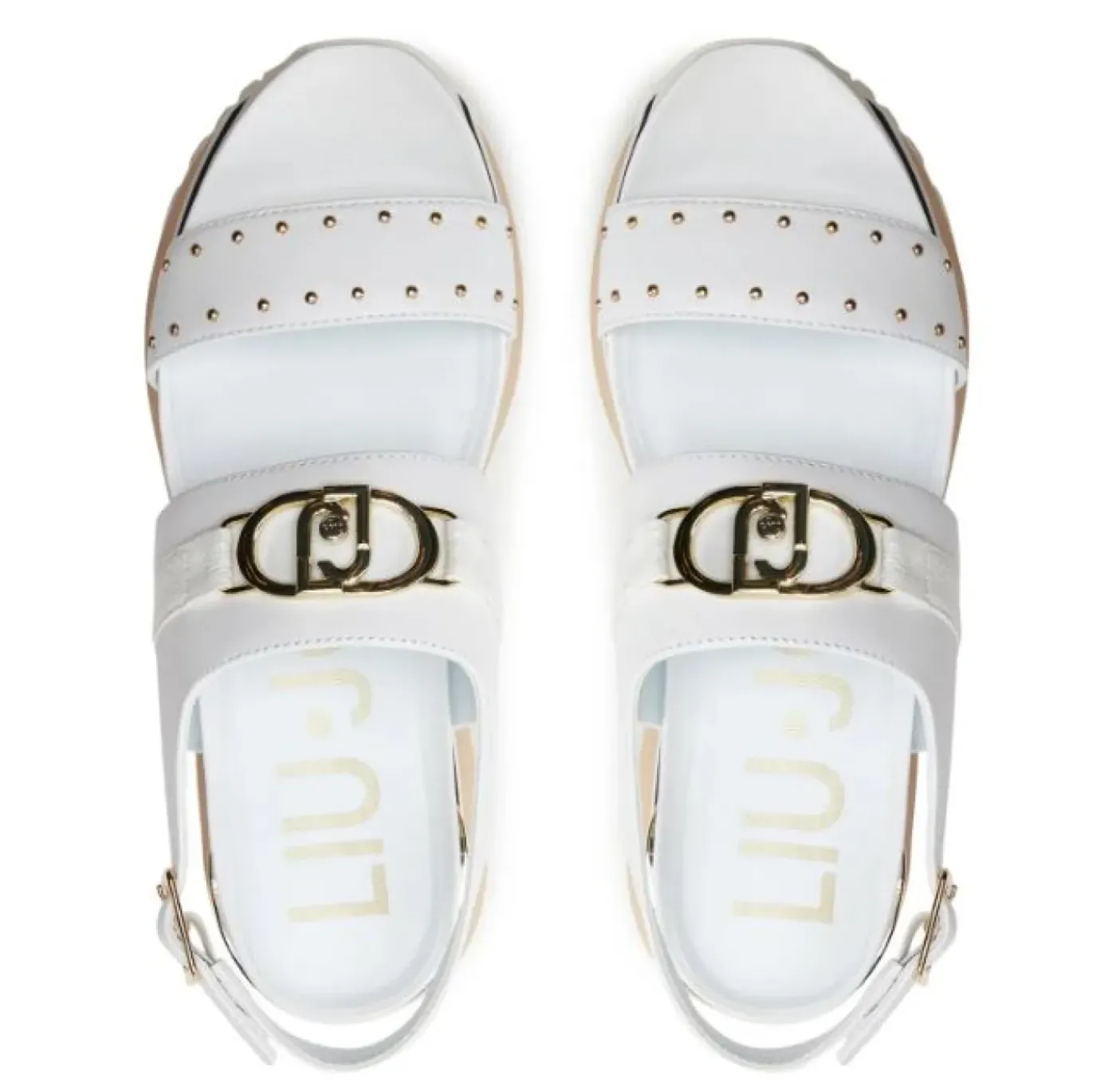 Sandalo in ecopelle con doppia fascia, fibbia metallica oro decorativa e miniborchie. Chiusura laterale regolabile. Fondo gomma plateau 11cm.
