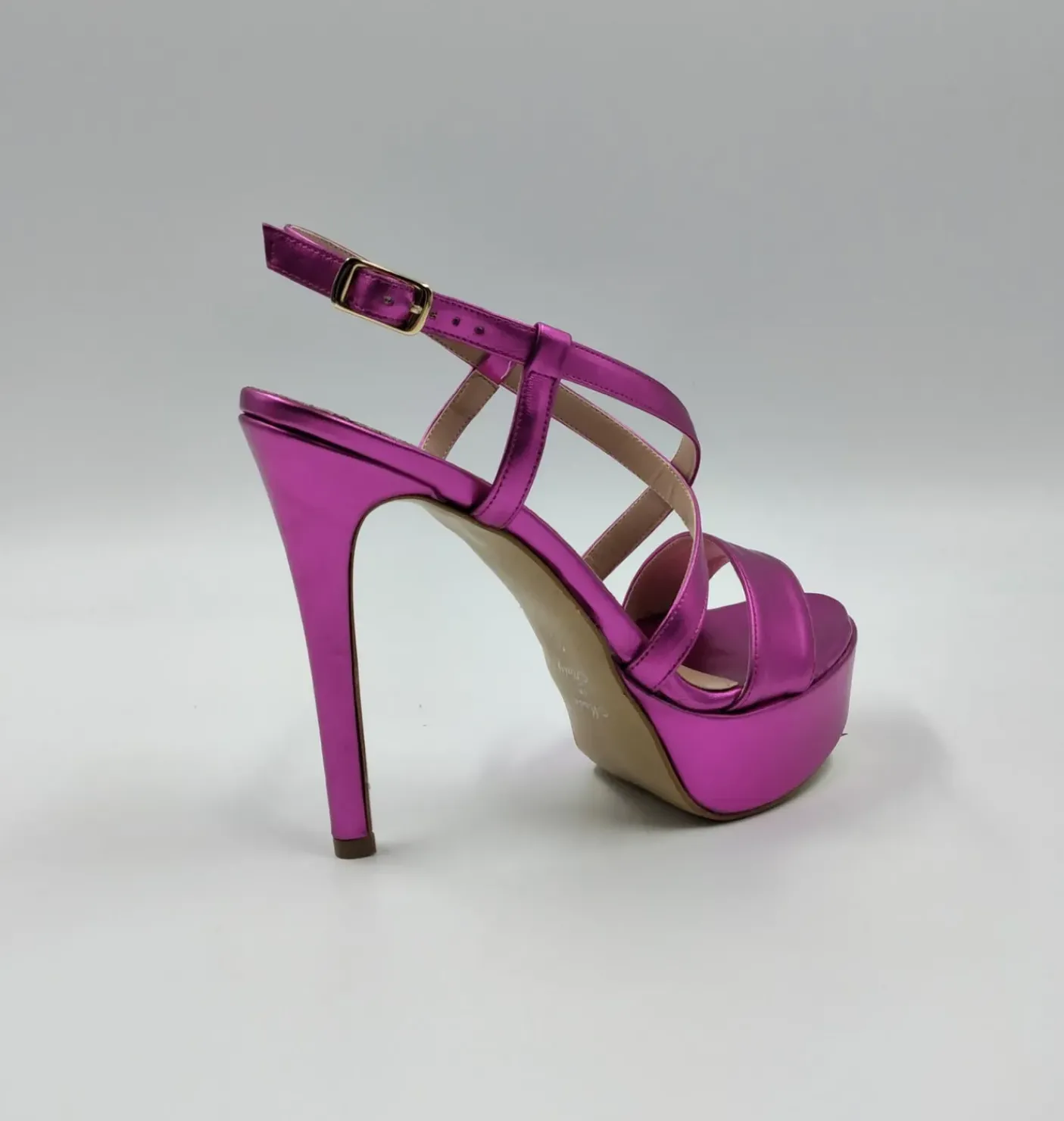 Sandali in pelle metallizzata fuxia. Sottopiede in pelle. Chiusura alla caviglia regolabile. Tacco 12cm plateau 2.5cm