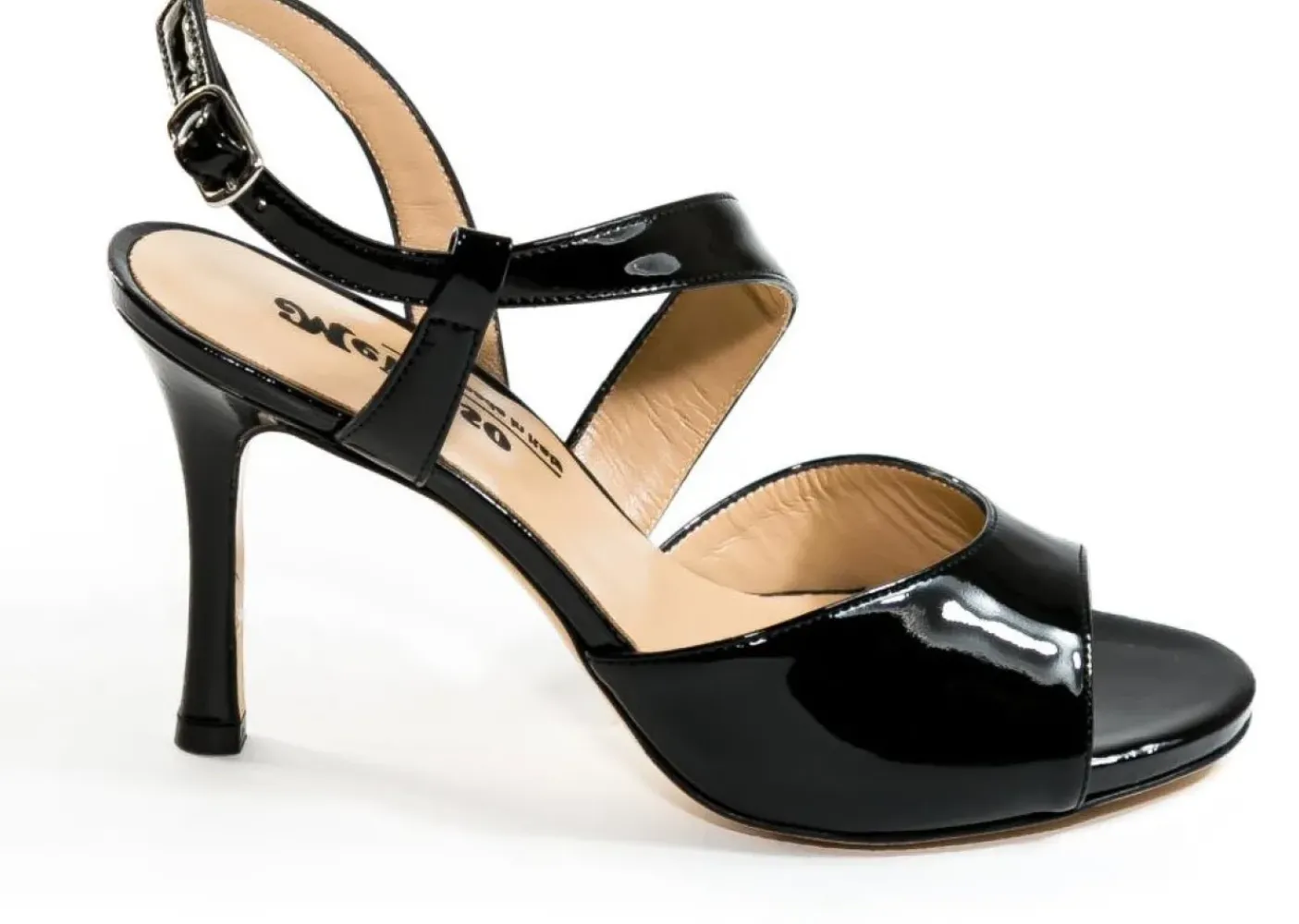 Sandali in pelle lucida, rivestiti internamente di pelle. Chiusura con fibbia laterale. Tacco 9cm