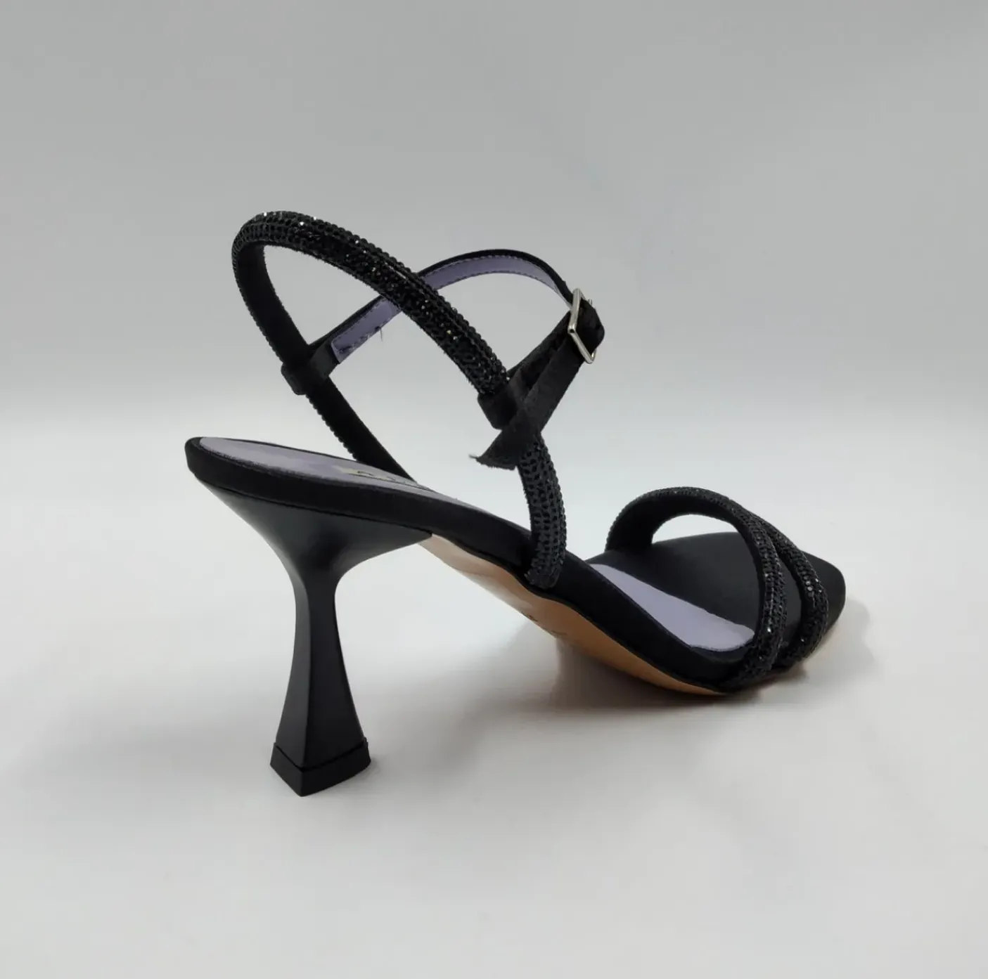 Sandalo con fasce raso applicazione fasce strass. Rivestito internamente in pelle. Soletta in pelle. Cinturino regolabile in raso. Suola in cuoio. Tacco 6cm
