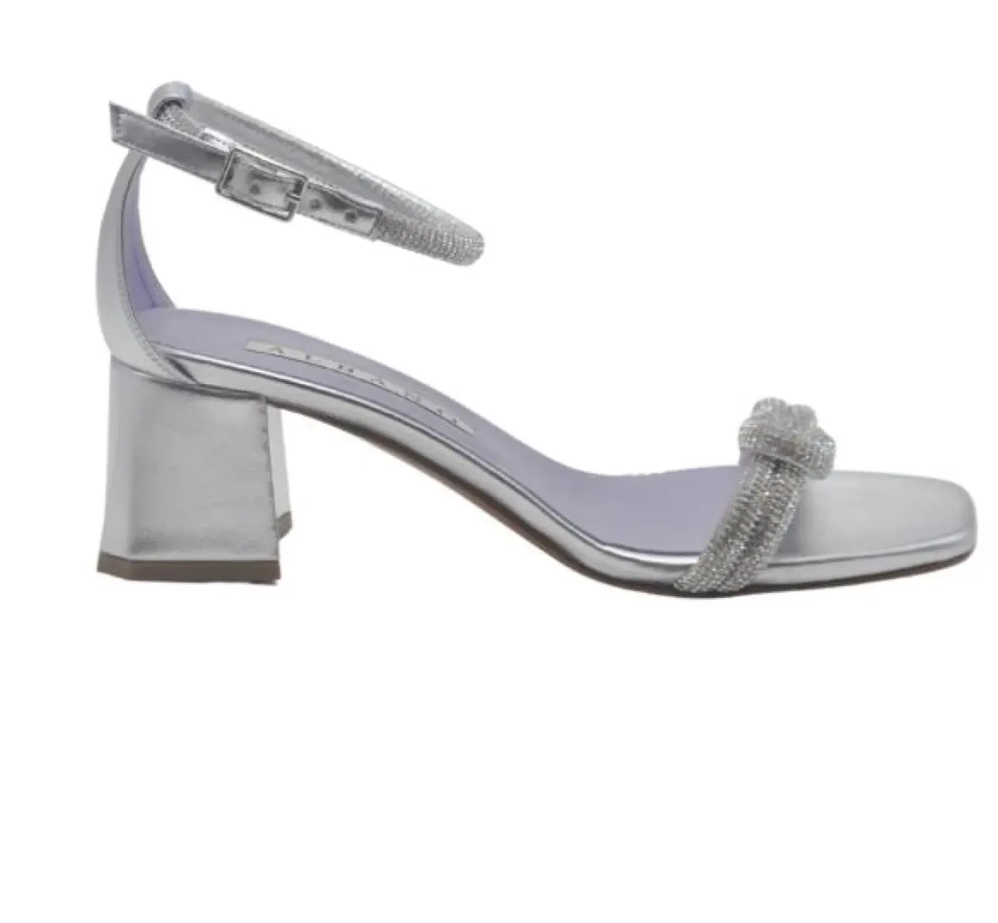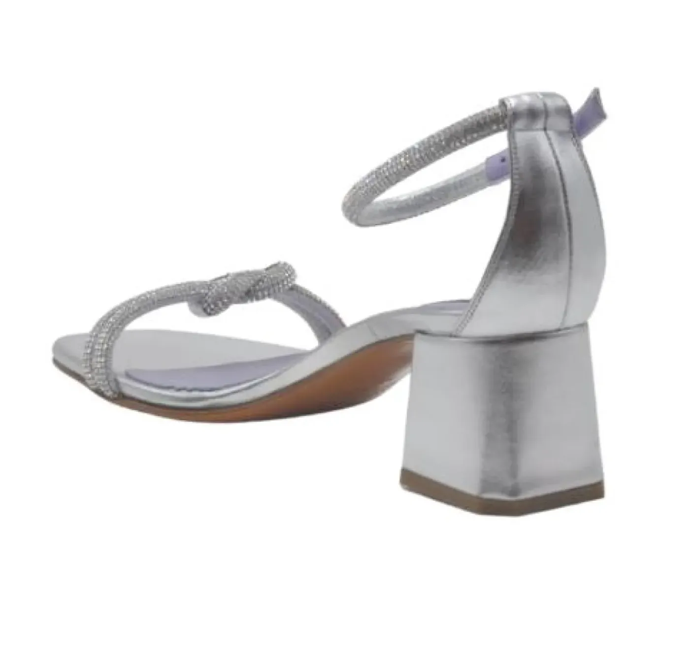 Sandali con fasce strass e nodo strass. Rivestito internamente in pelle. Chiusura con laccio strass alla caviglia regolabile. Tacco quadrato 5cm. Fondo cuoio.