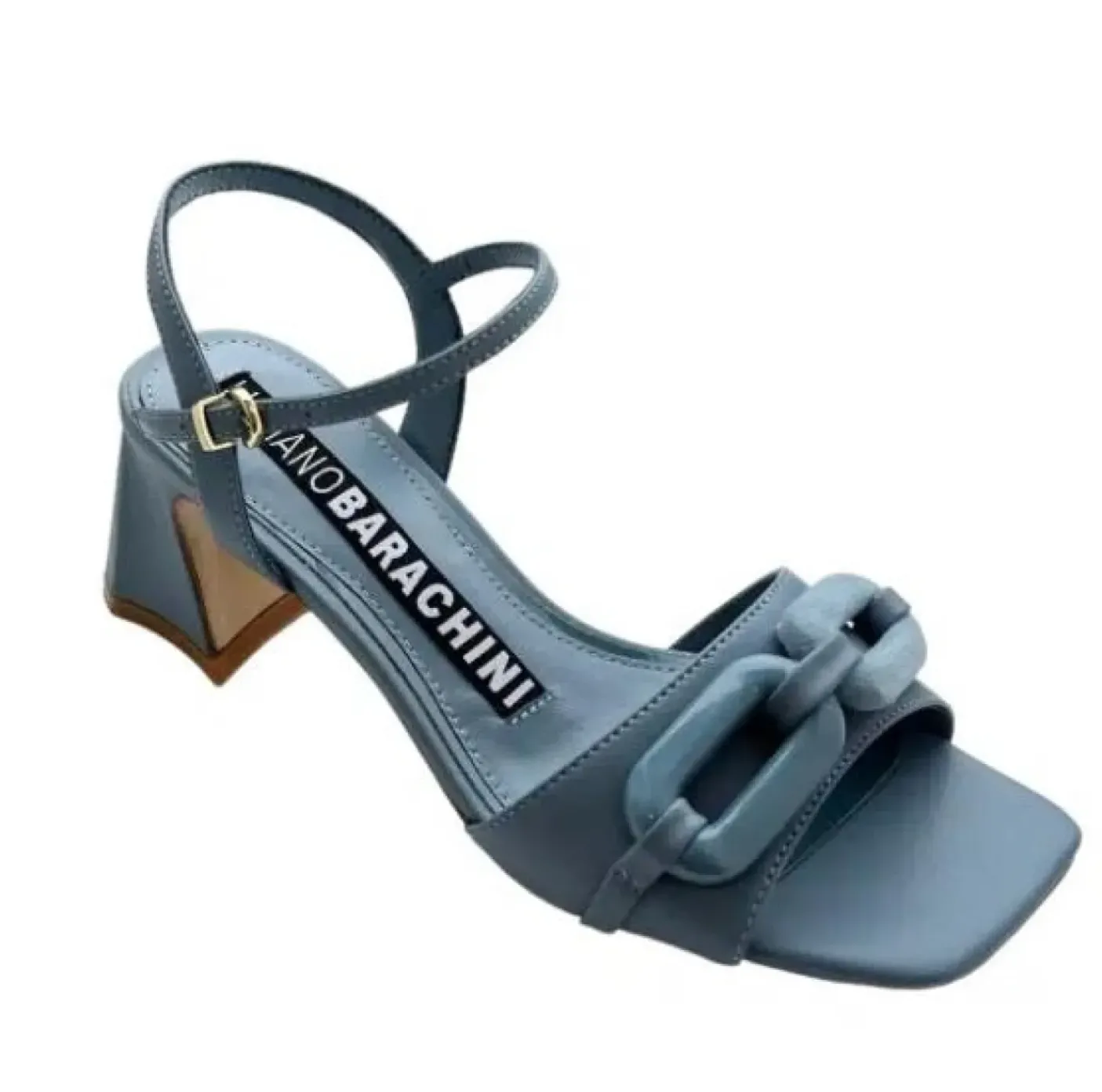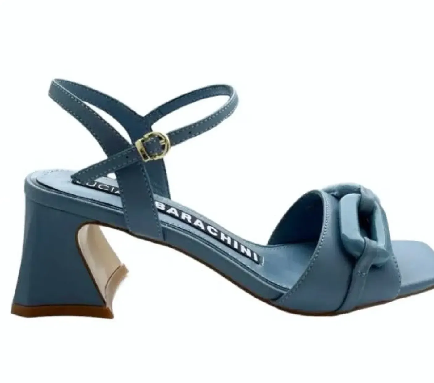 Sandali in vera pelle morbida con soletta in pelle. Chiusura alla caviglia regolabile. Tacco squadrato 7cm. Applicazione metallo catena pelle.