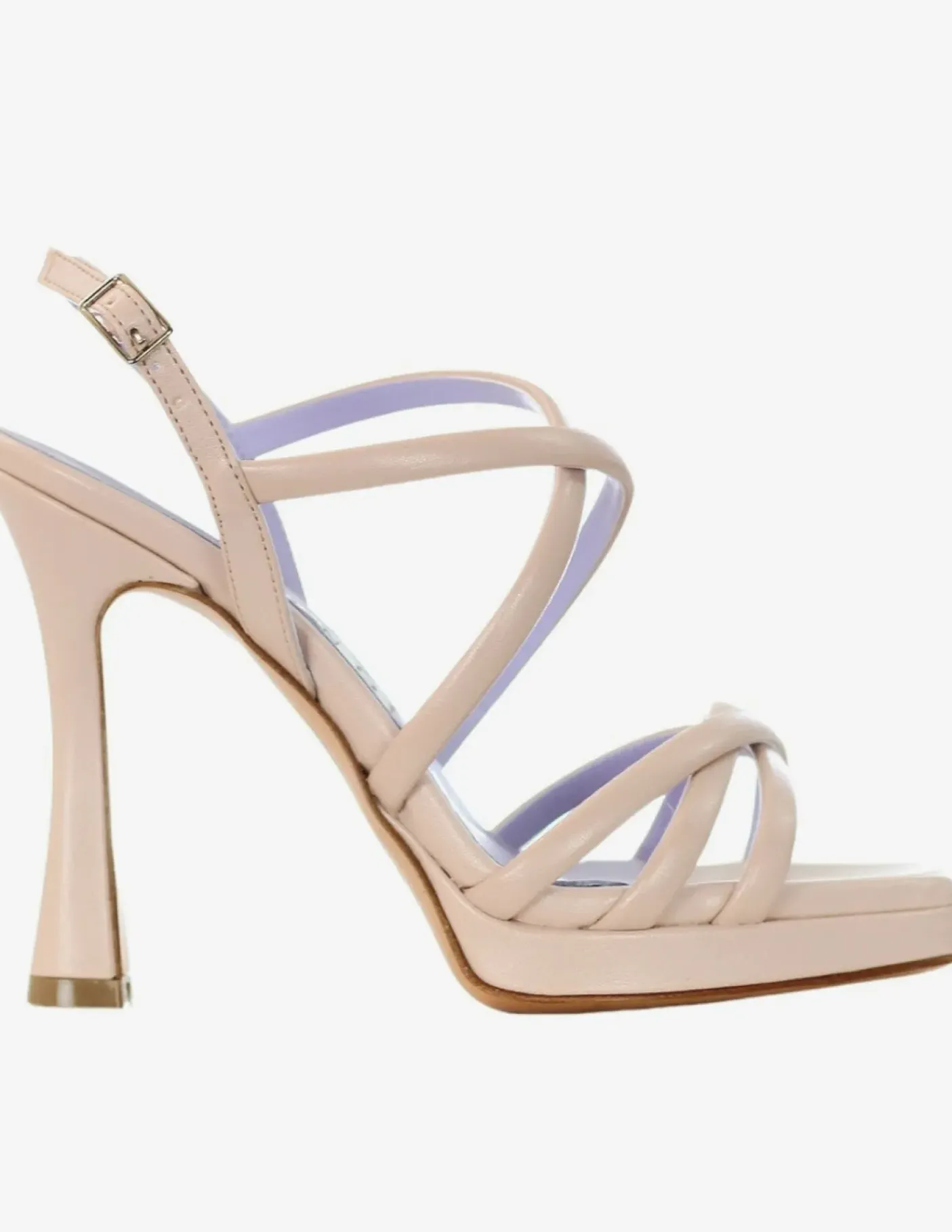Sandali in pelle con fasce incrociate, chiusura con cinturino regolabile. Rivestito internamente in pelle. Soletta in pelle. Fondo cuoio, tacco 11cm plateau 1cm.