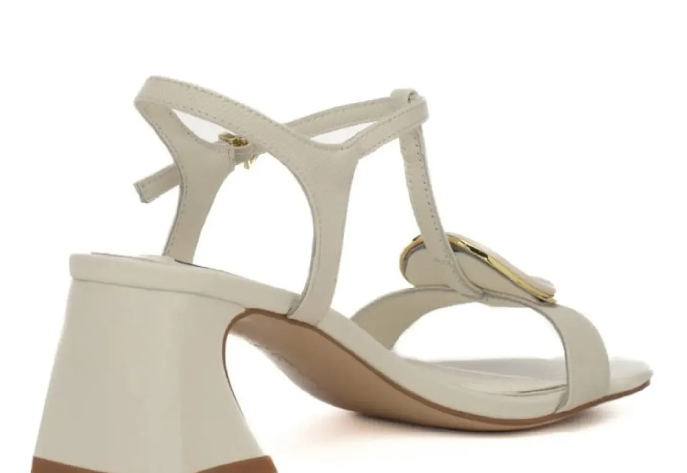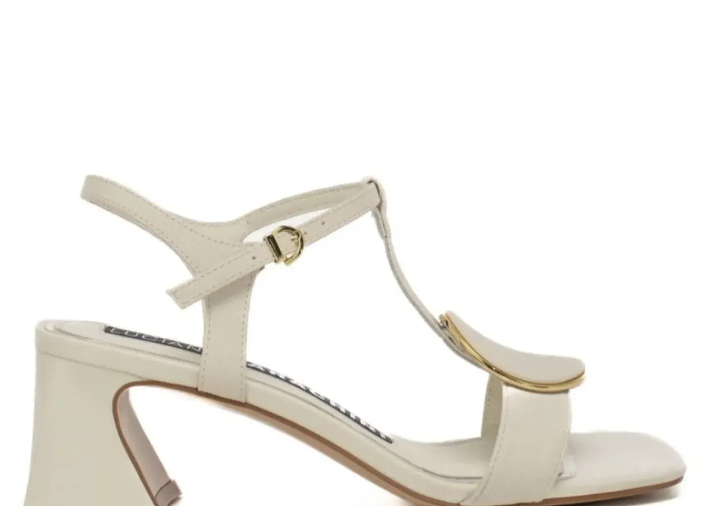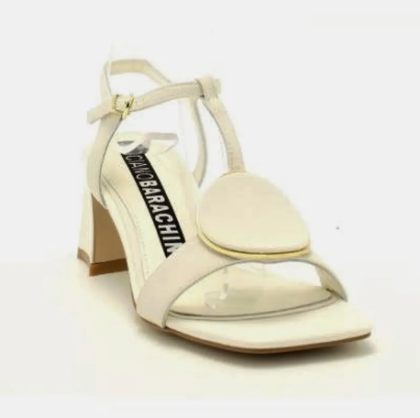 Sandali in vera pelle morbida con soletta in pelle. Chiusura alla caviglia regolabile. Tacco squadrato 7cm. Applicazione metallo e pelle ovale.