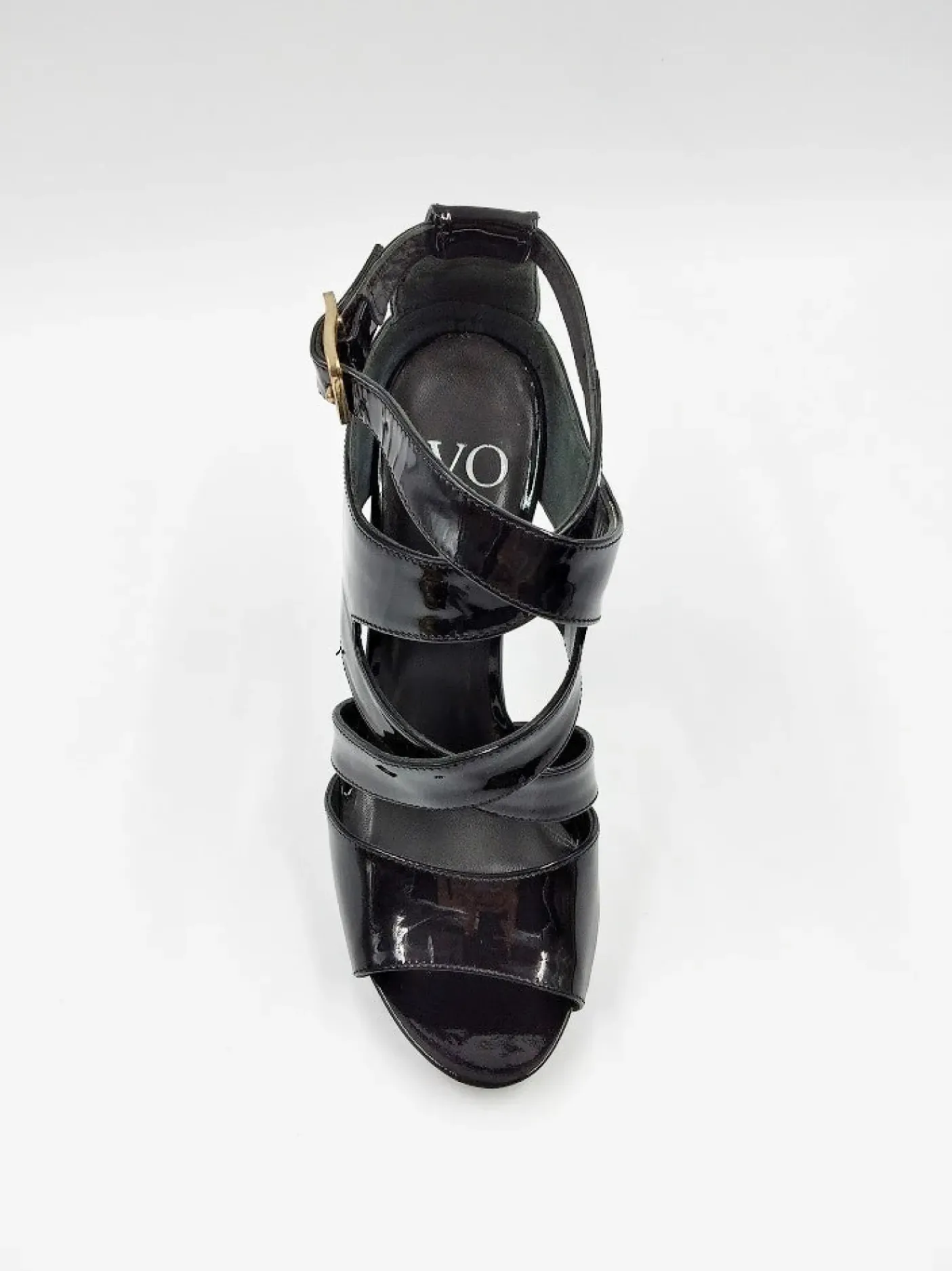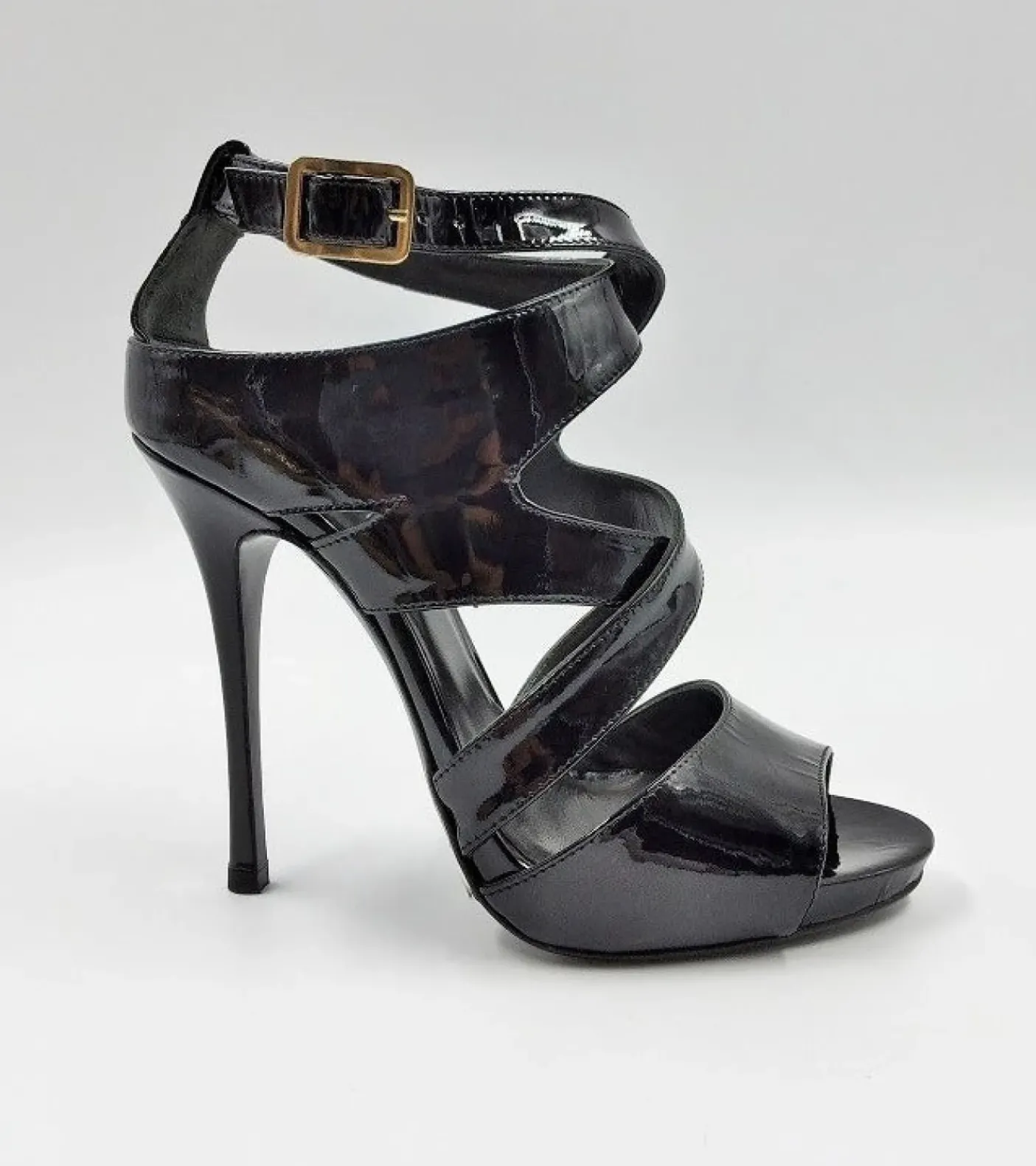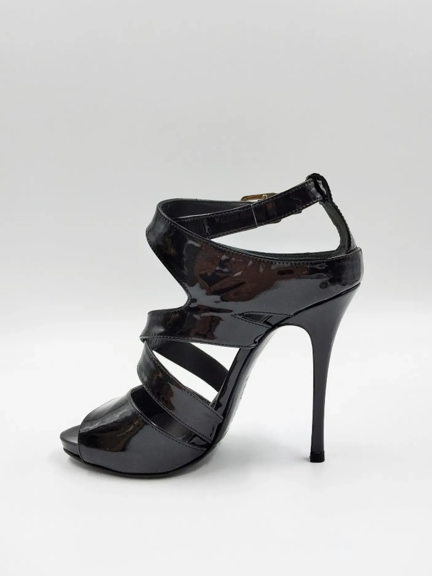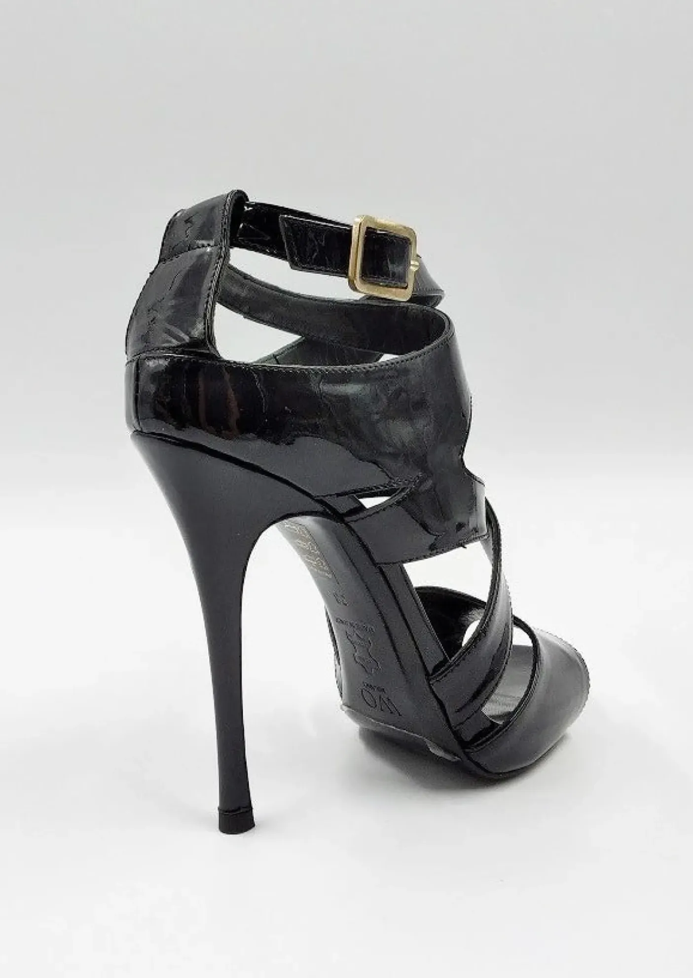 Sandali in pelle lucida nera, chiusura con fibbia sulla caviglia.