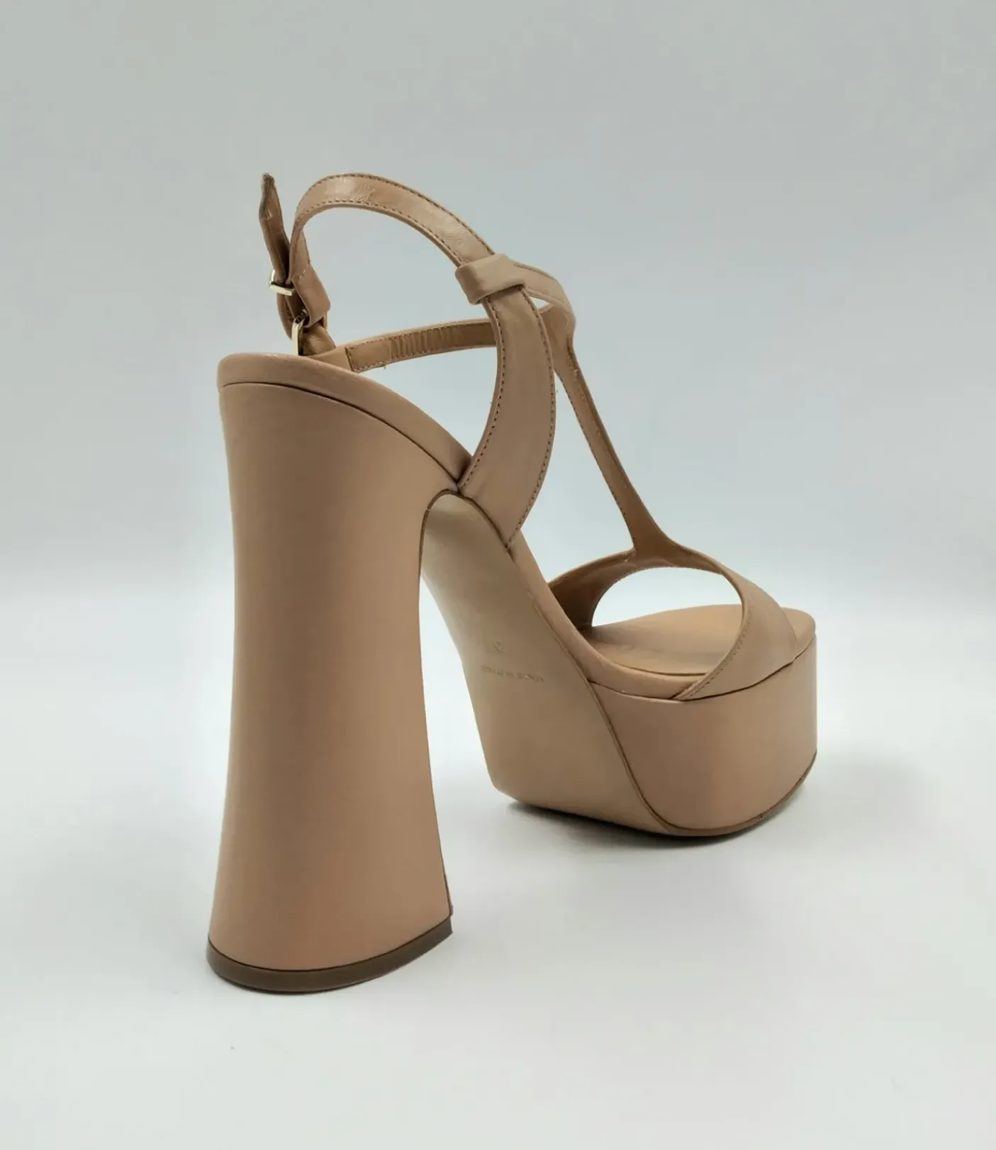 Sandalo in morbida pelle con chiusura alla caviglia regolabile. Tacco 14cm e plateau 4cm.