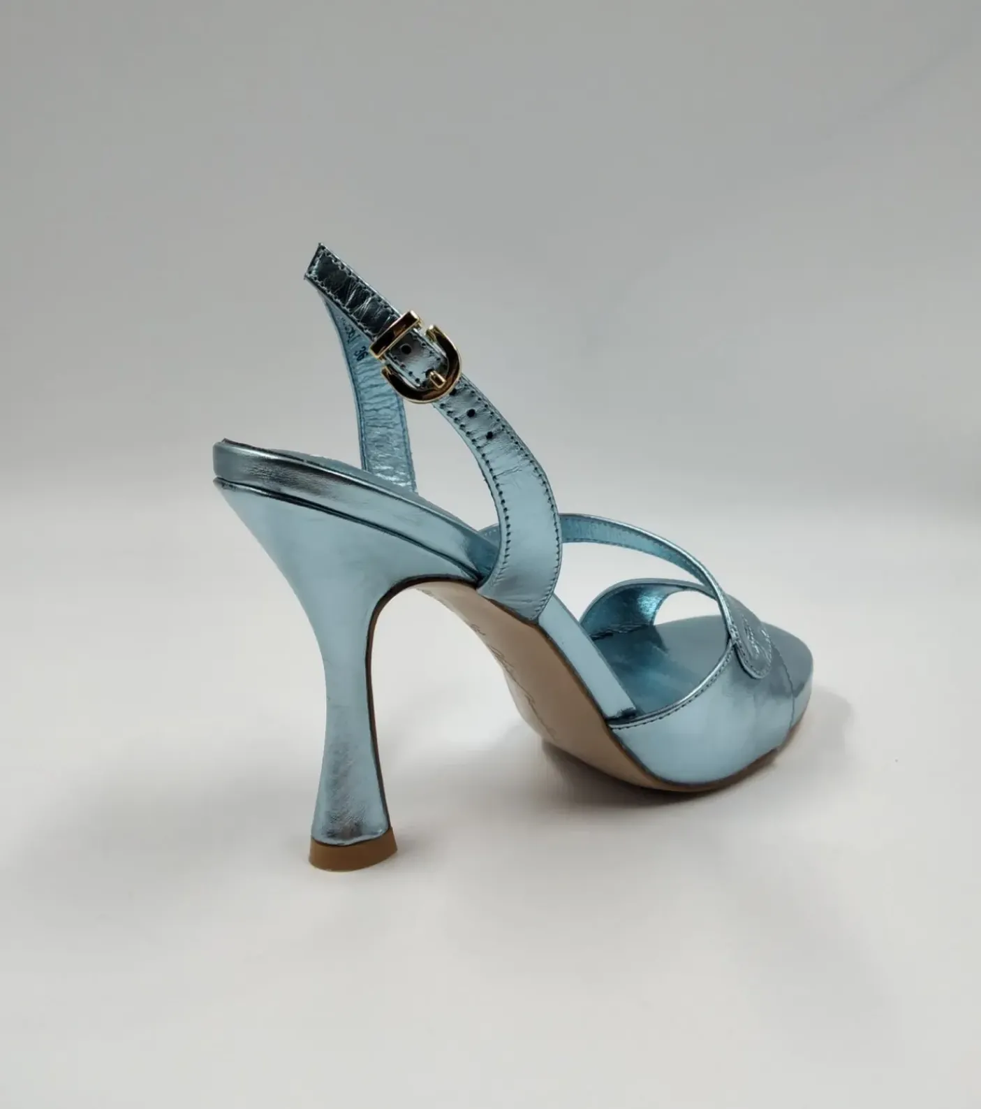 Sandali in pelle metallizzata. Sottopiede in pelle. Chiusura regolabile. Tacco 10cm plateau 1cm.