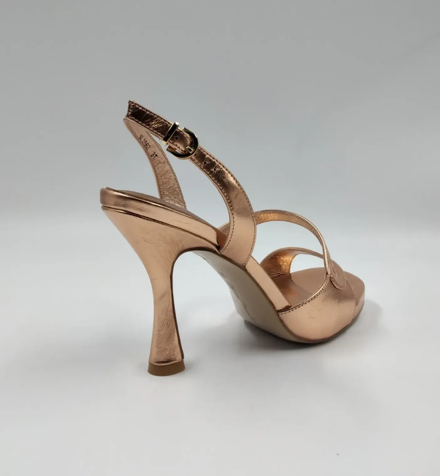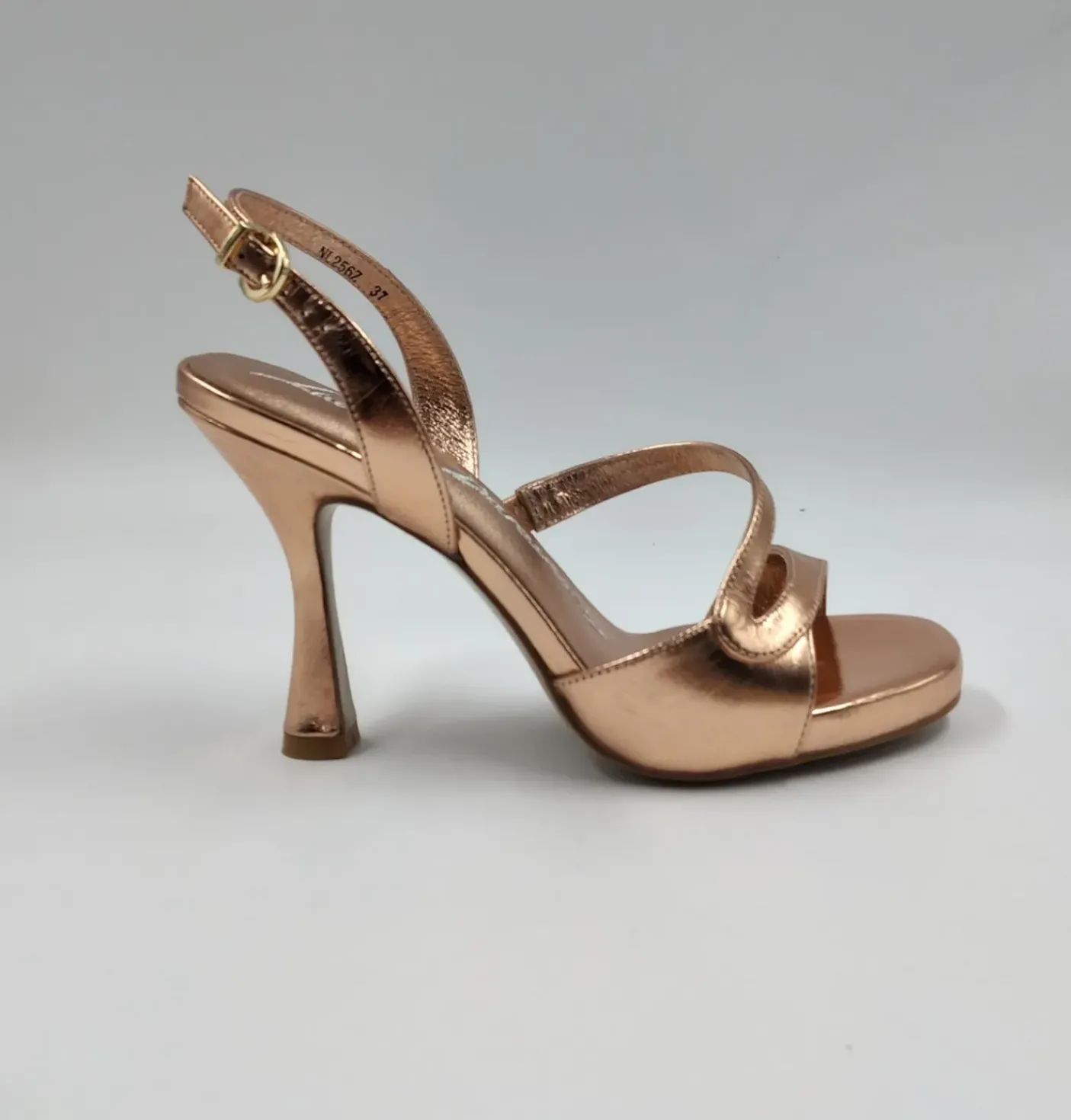 Sandali in pelle metallizzata. Sottopiede in pelle. Chiusura regolabile. Tacco 10cm plateau 1cm.