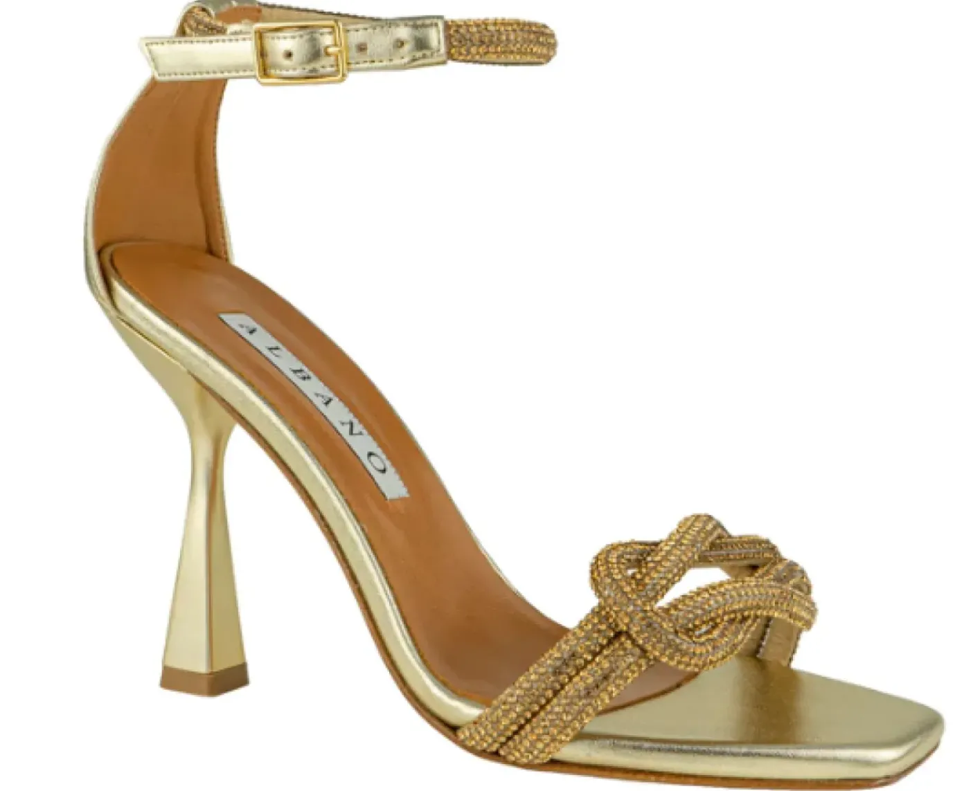 Sandali in pelle metallizzata con nodo on applicazioni strass. Rivestito in pelle. Cinturino alla caviglia. Fondo in cuoio. Tacco 9cm