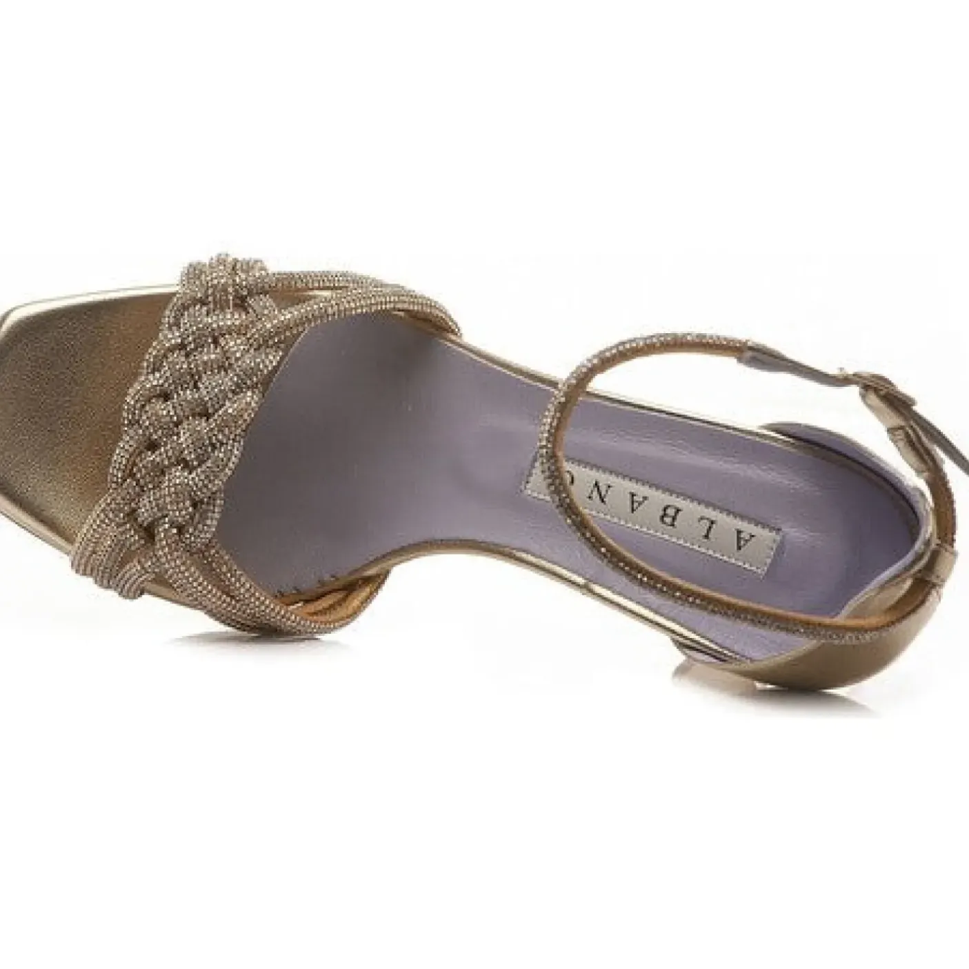 Sandali rame con decorazione multi treccia applicazione strass. Rivestito internamente in pelle. Soletta in vera pelle. Cinturino alla caviglia con strass, regolabile. Suola in cuoio. Tacco 9cm