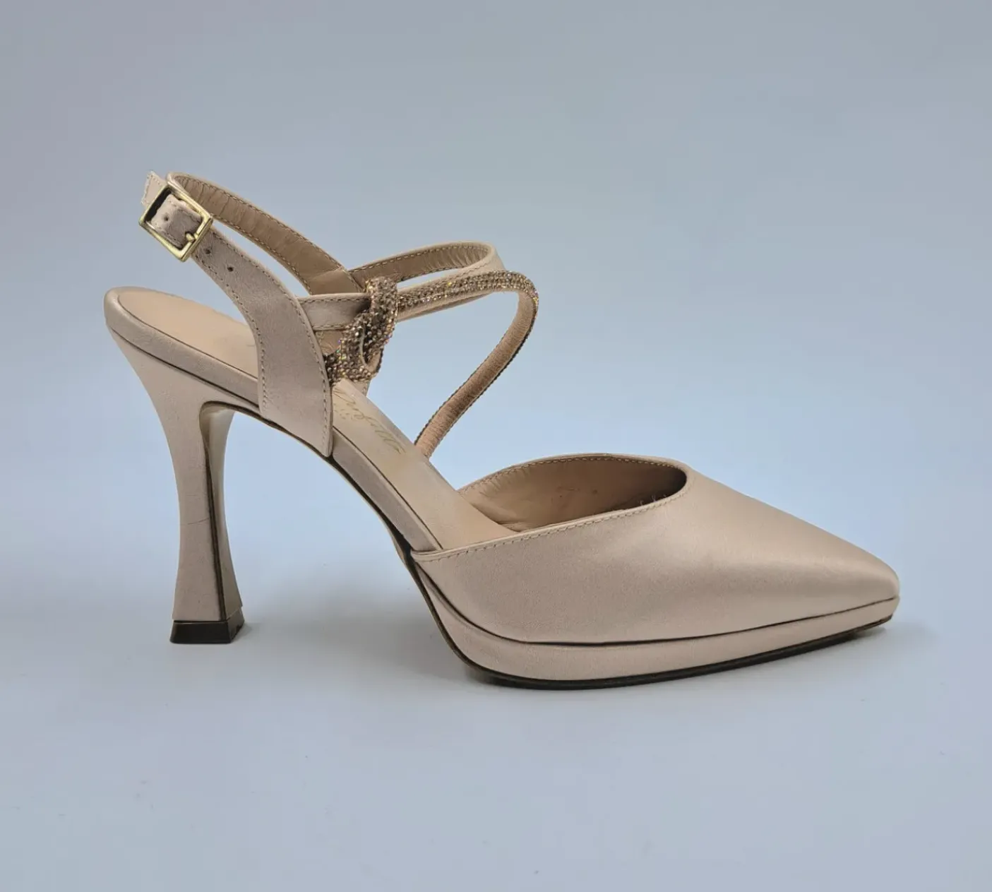 Sandali in raso rivestito internamente in pelle. Chiusura regolabile. Decorazione nodo strass laterale. Tacco 10cm