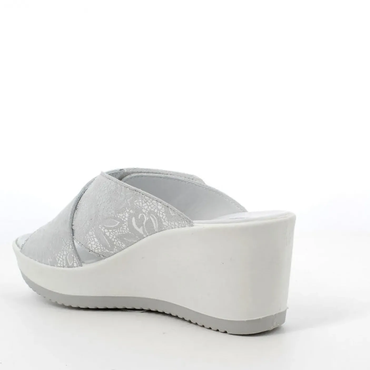 Sandali in pelle stampata con motivo floreale. Chiusura superiore con strappo. Fondo in gomma. Zeppa 6,5cm