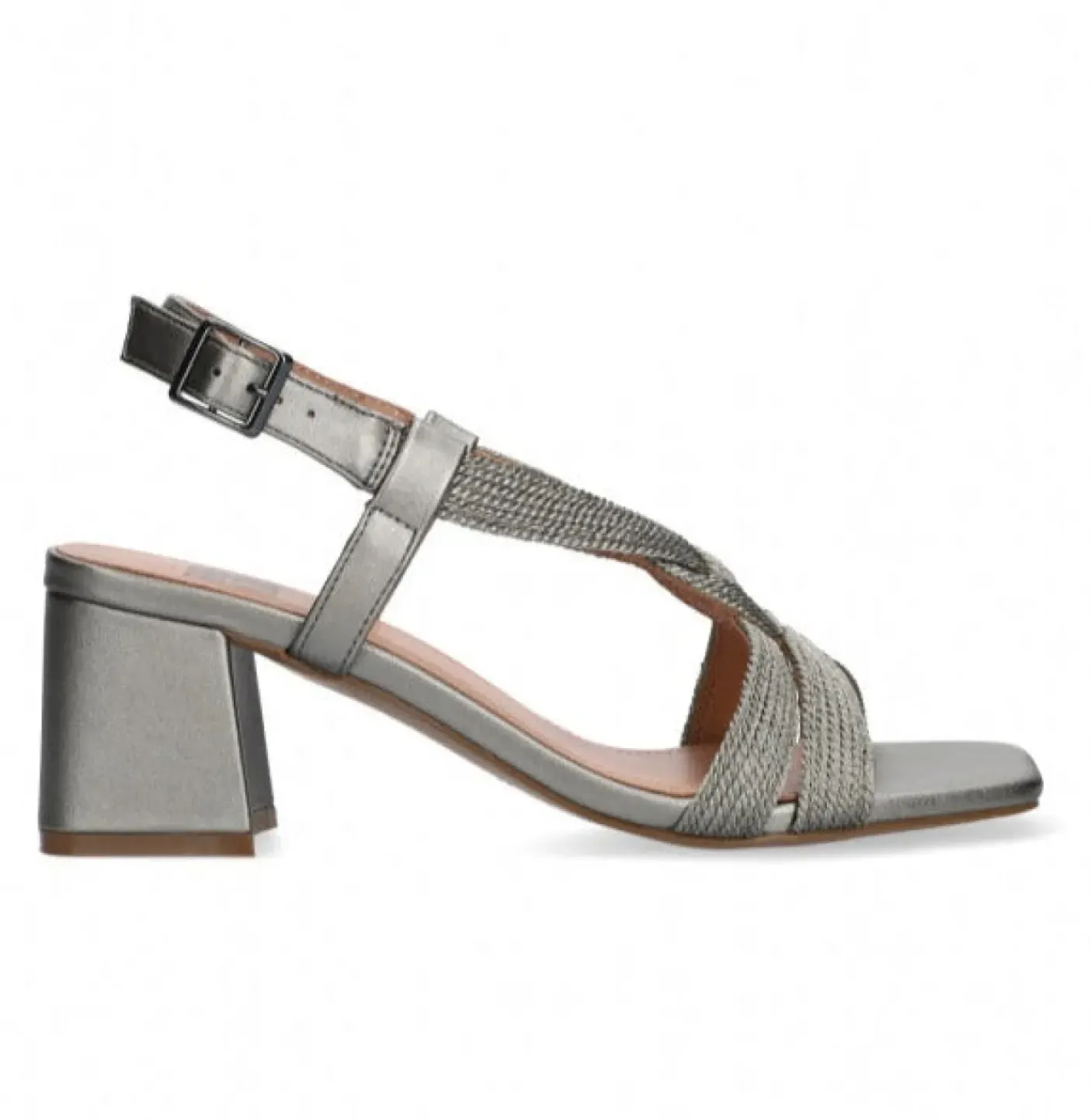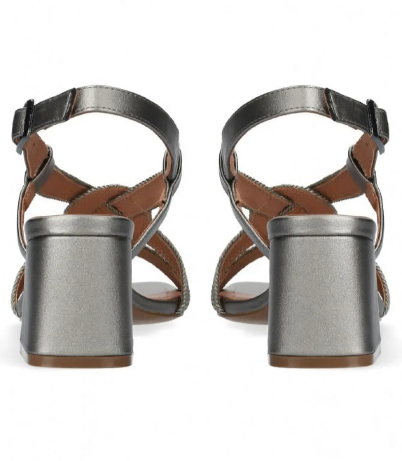 Sandali realizzati in tessuto similcorda ed ecopelle. Rivestito internamente in pelle. Chiusura con fibbia regolabile. Punta squadrata. Fondo in gomma. Tacco 6 cm