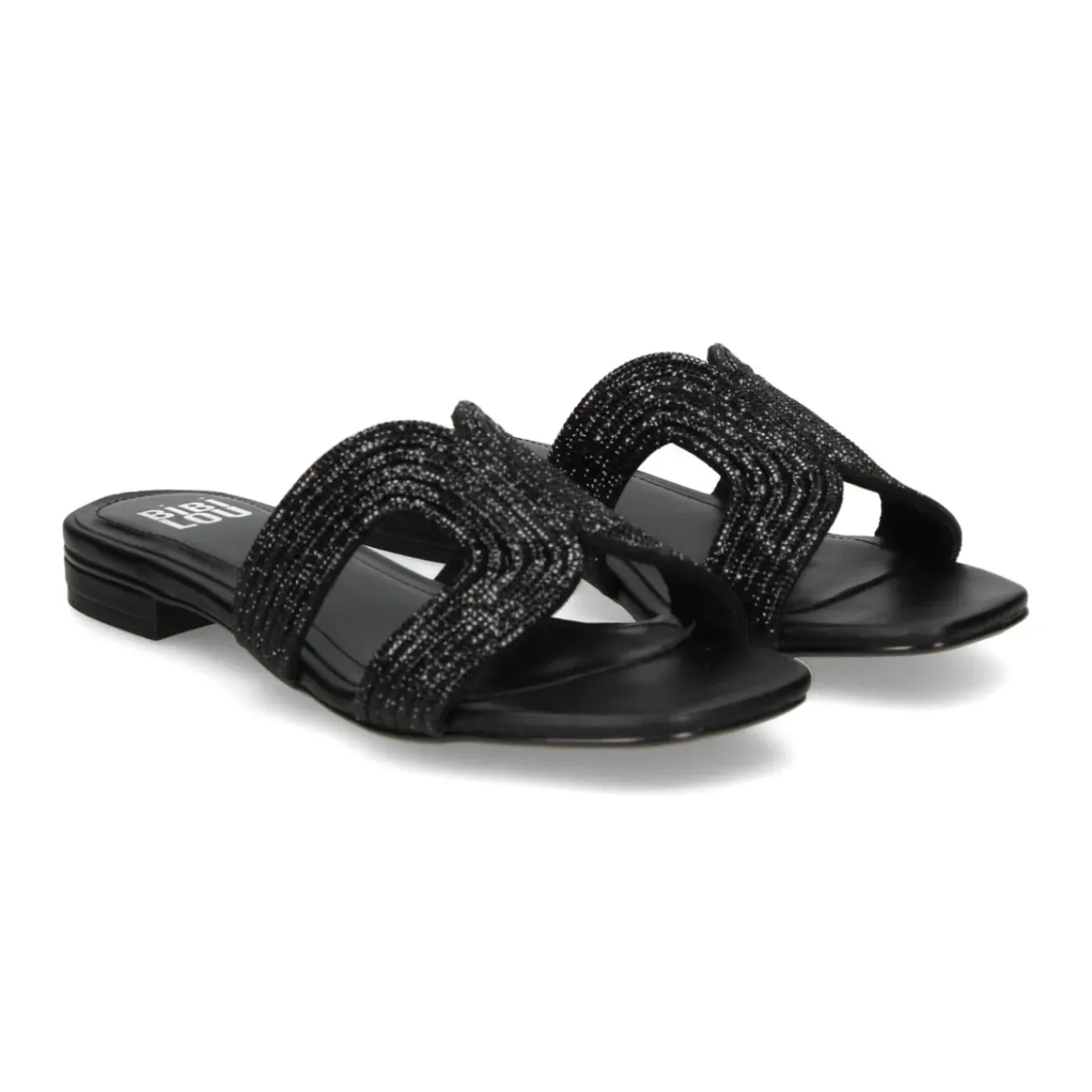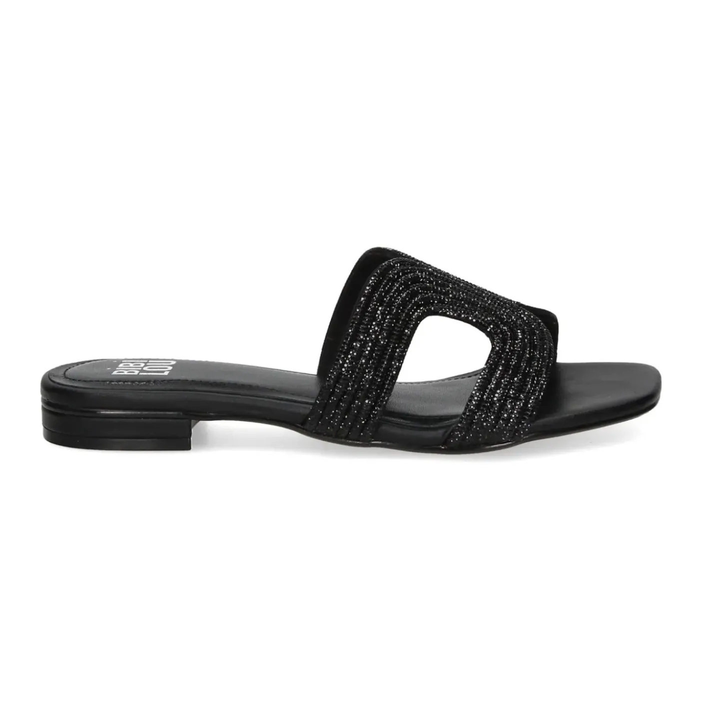 Sandali in materiale sintetico con micro strass. Rivestito internamente in pelle. Punta squadrata. Tacco piatto 1,5 cm