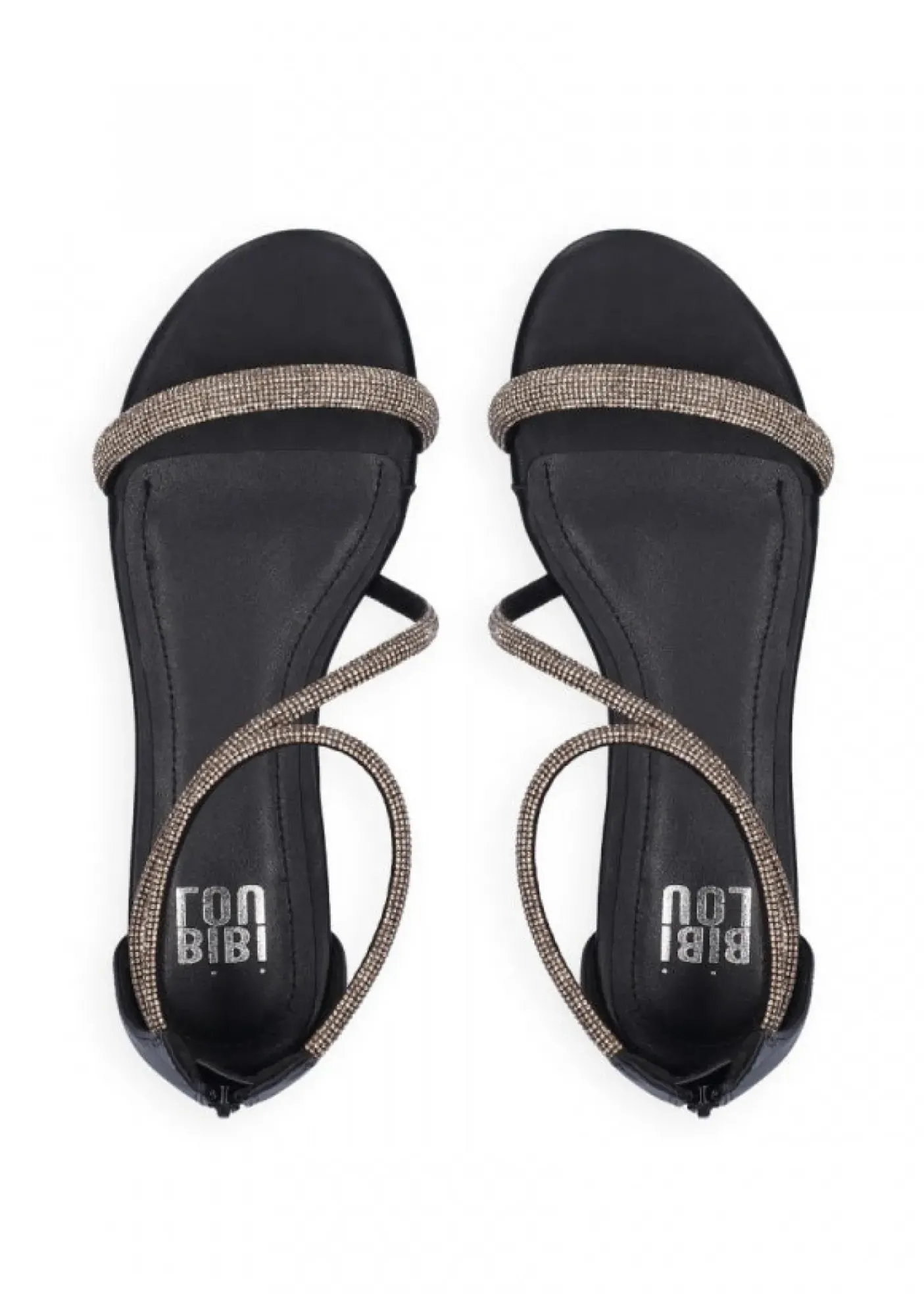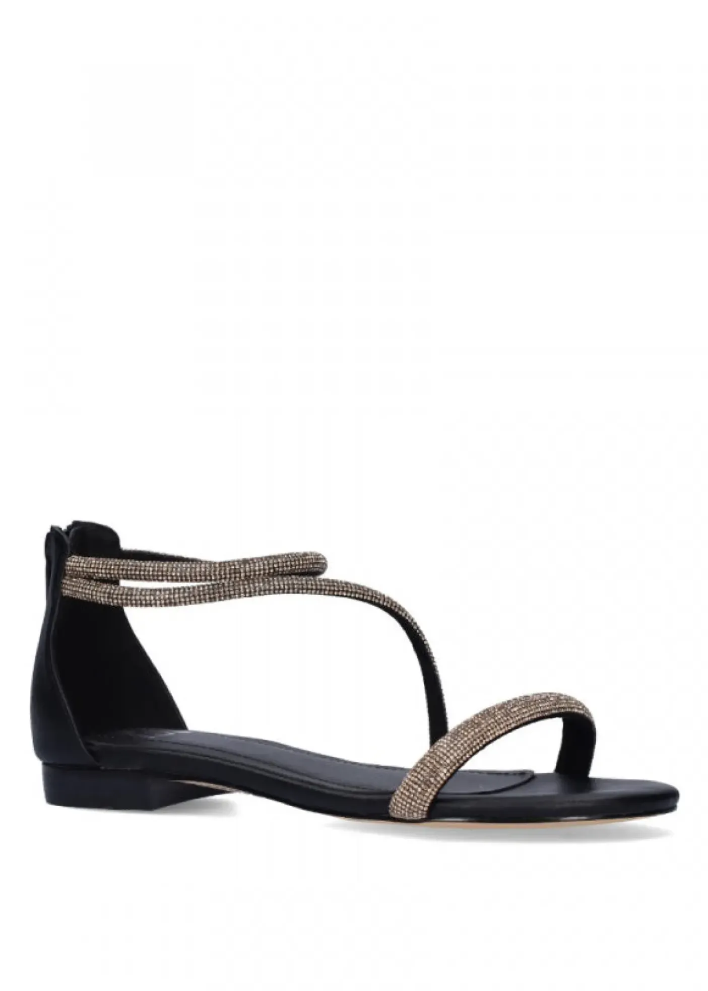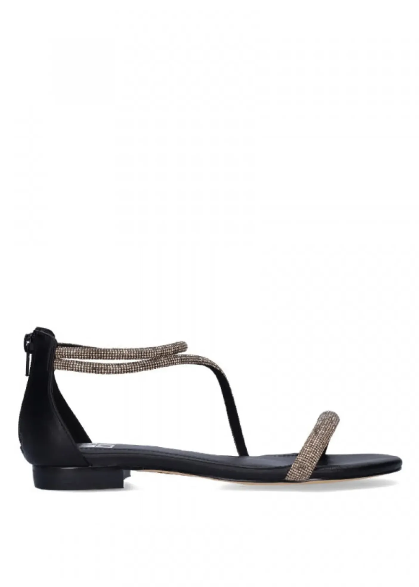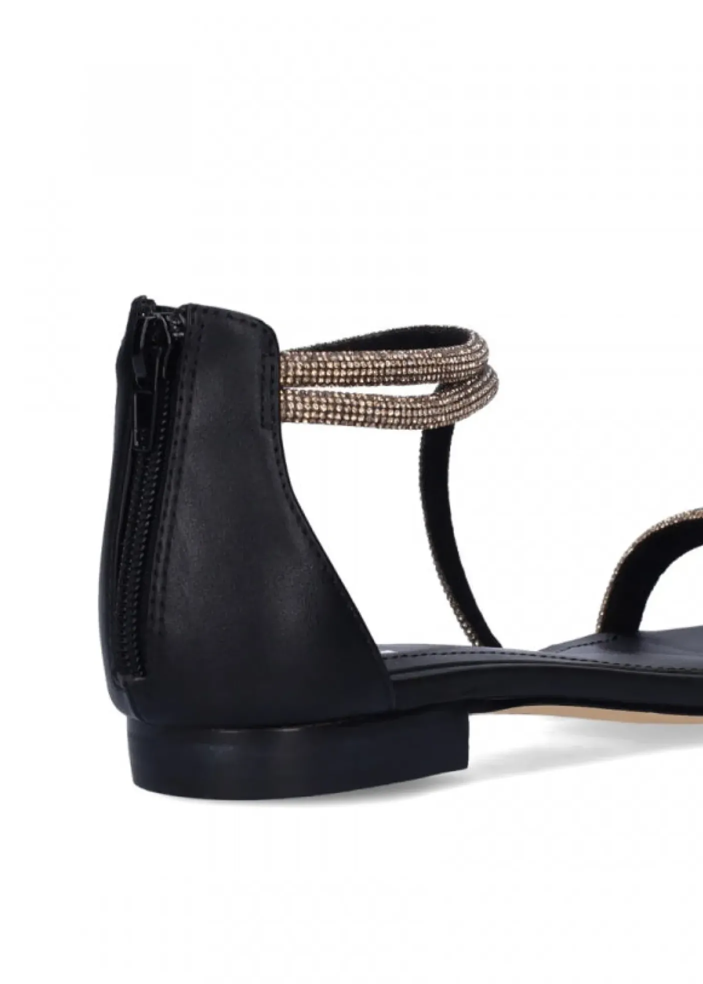 Sandali in materiale sintetico, rivestiti internamente in pelle. Fasce con micro strass bronzo. Chiusura con zip posteriore. Tacco 1,5cm