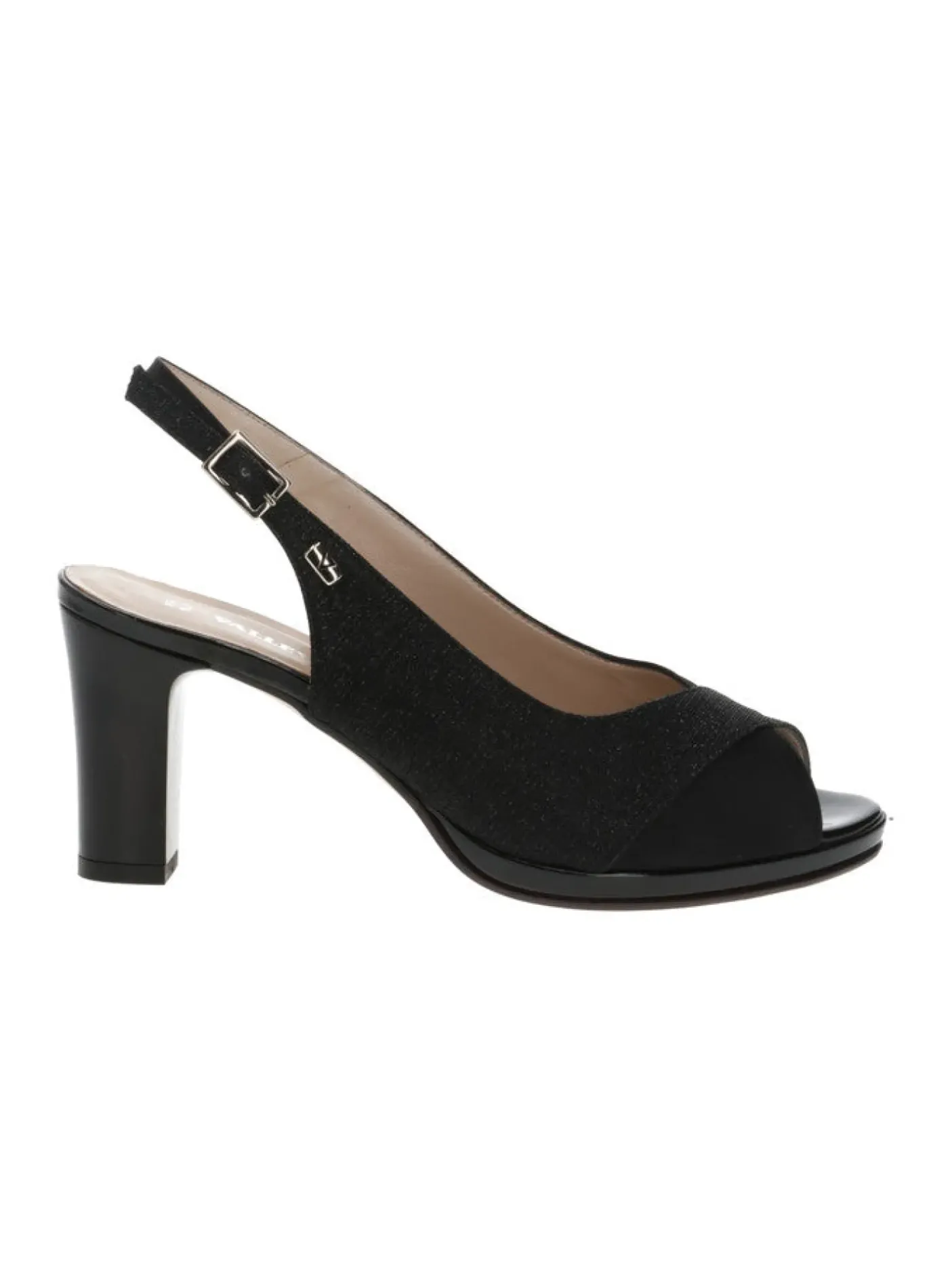 Sandali in tessuto brillantinato e tessuto nero. Rivestito internamente in pelle. Chiusura con fibbia regolabile. Sottopiede in vera pelle.
