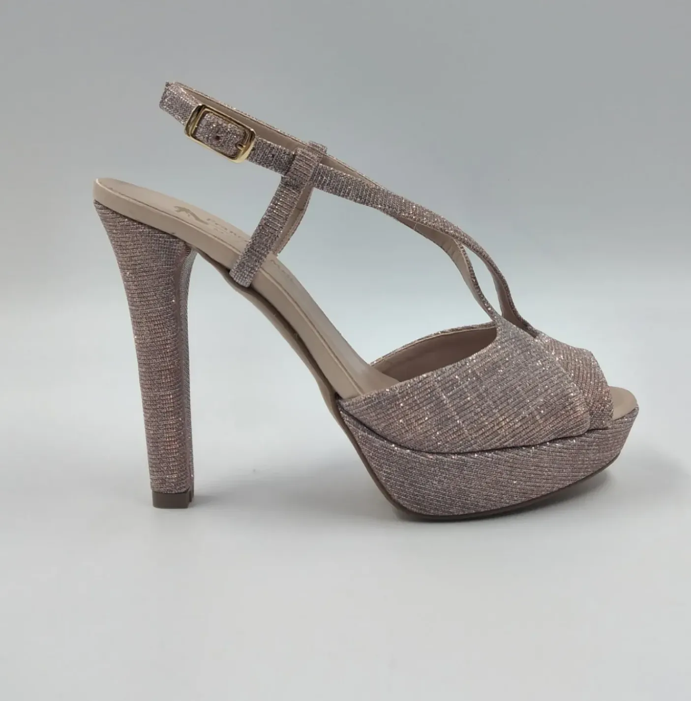 Sandali in tessuto laminato base rosa. Rivestita internamente in pelle. Chiusura regolabile alla caviglia. Tacco 12cm plateau 2cm