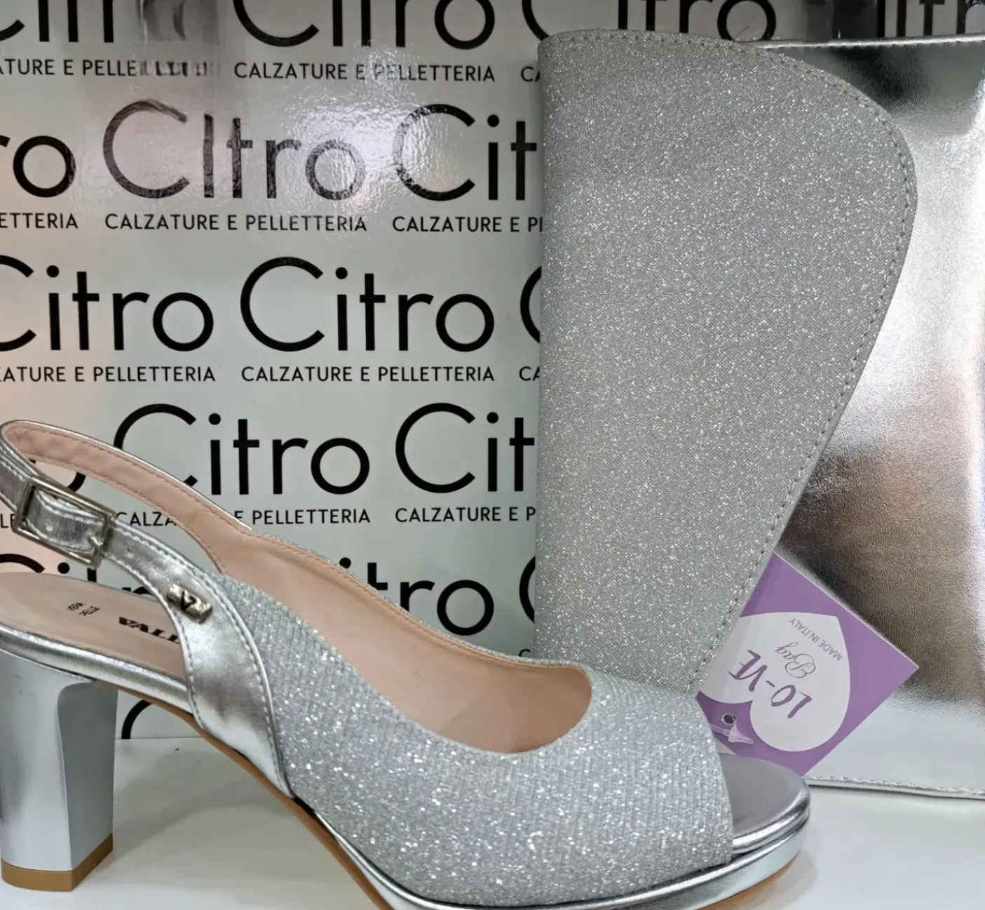 Sandali in tessuto brillantinato silver e dettagli pelle lucida. Rivestito internamente in pelle. Chiusura con fibbia. Disponibile pochette abbinata.