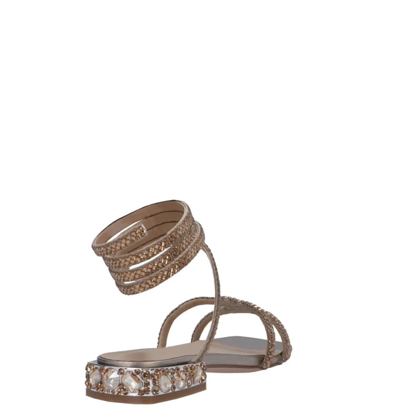 Sandali con applicazione micro strass. Rivestito in pelle. Soletta imbottita in pelle. Laccio alla caviglia modellante rivestito in micro strass e internamente in pelle. Tacco rivestito con strass altezza 1cm.