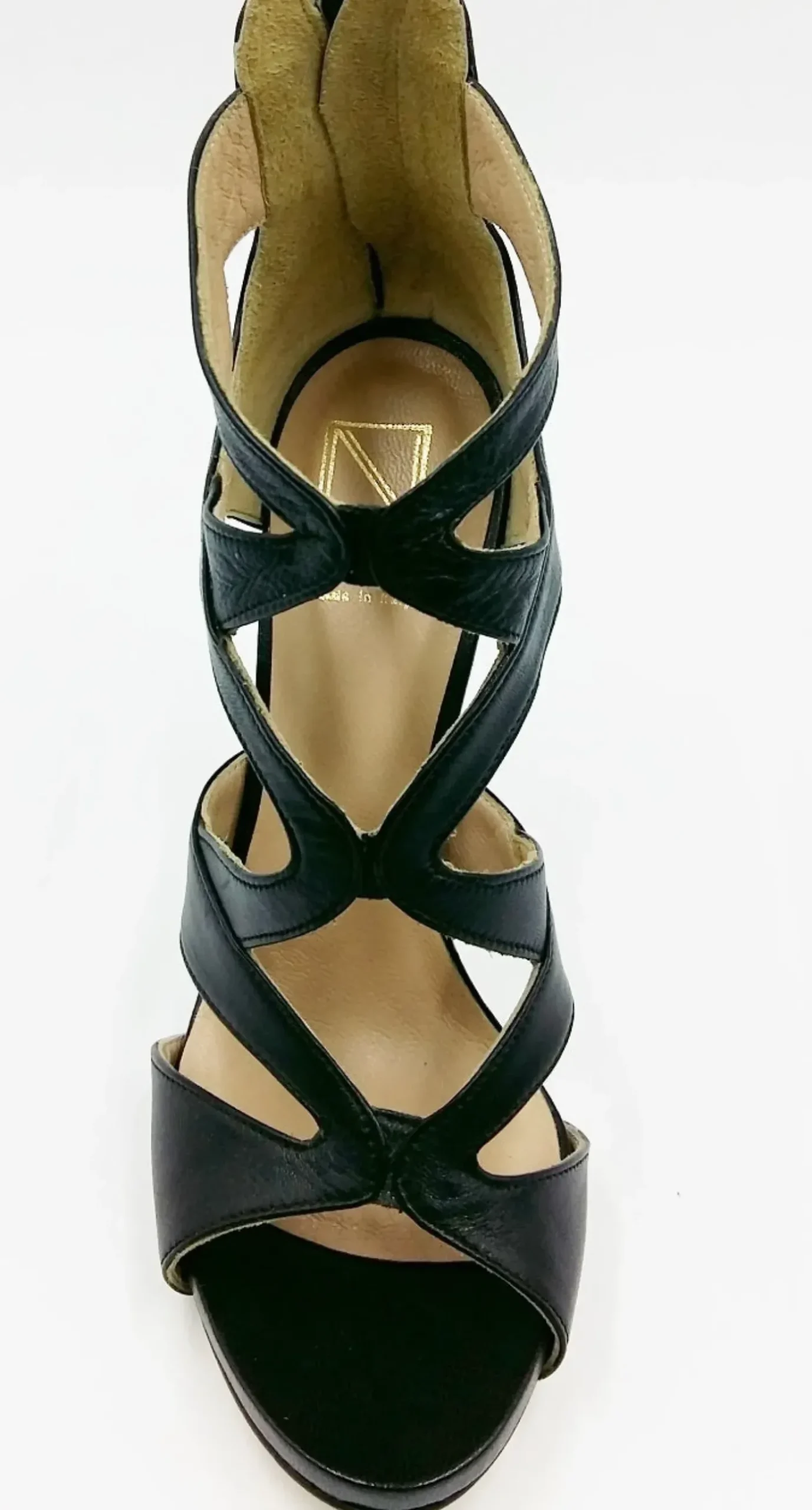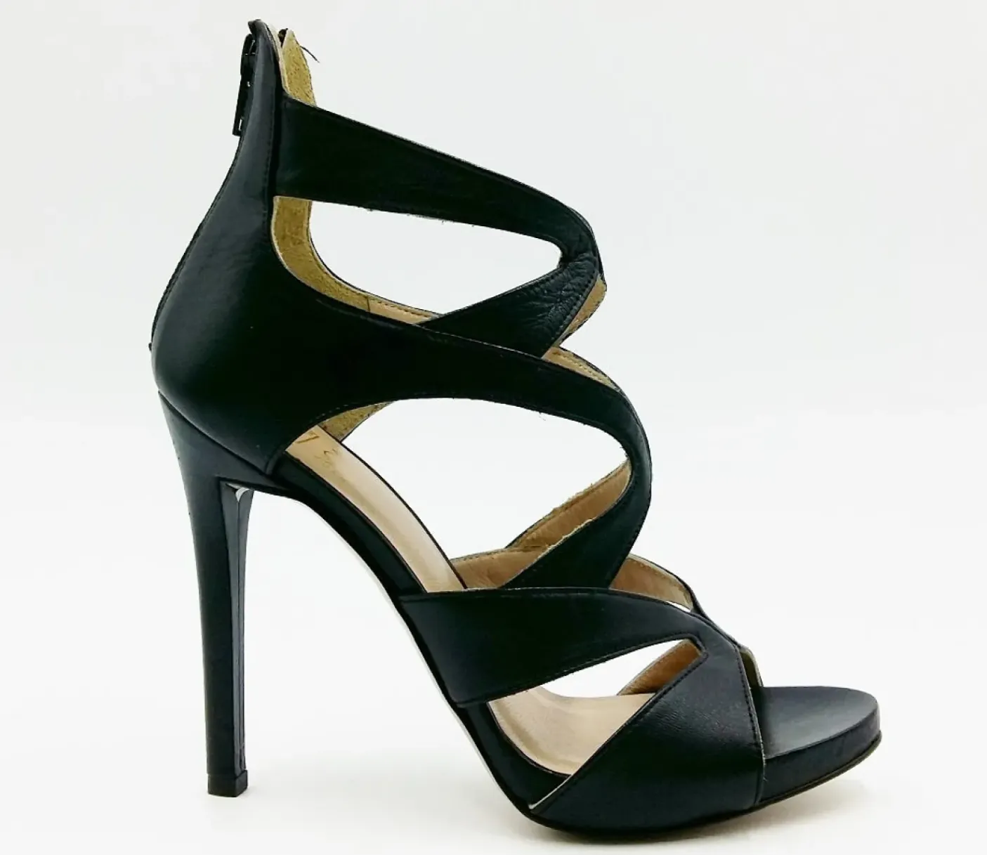 Sandali tronchetto in vera pelle nera morbida, rivestito tutto internamente in pelle. Chiusura con cerniera posteriore. Suola in vero cuoio. Tacco rivestito in pelle 12 cm.