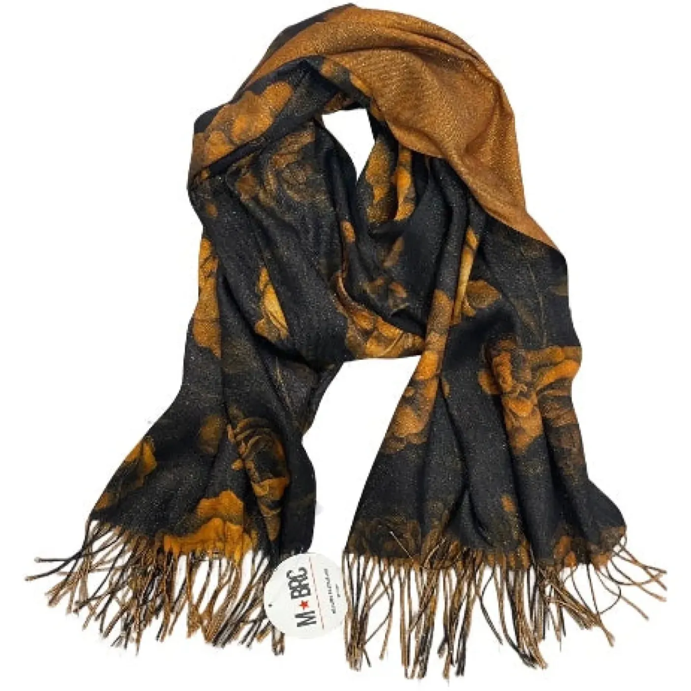 Sciarpa fantasia colore fantasia rose ocra. Con frange. Double face. 100% viscosa morbida.