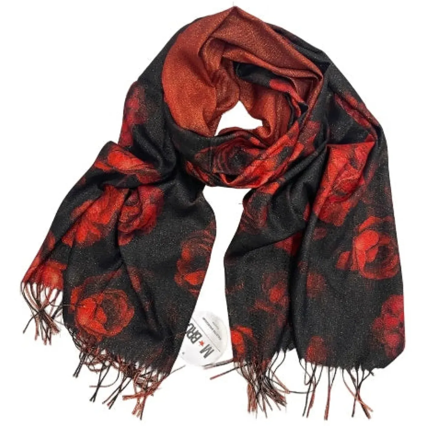 Sciarpa fantasia colore fantasia rose rosse. Con frange. Double face. 100% viscosa morbida.