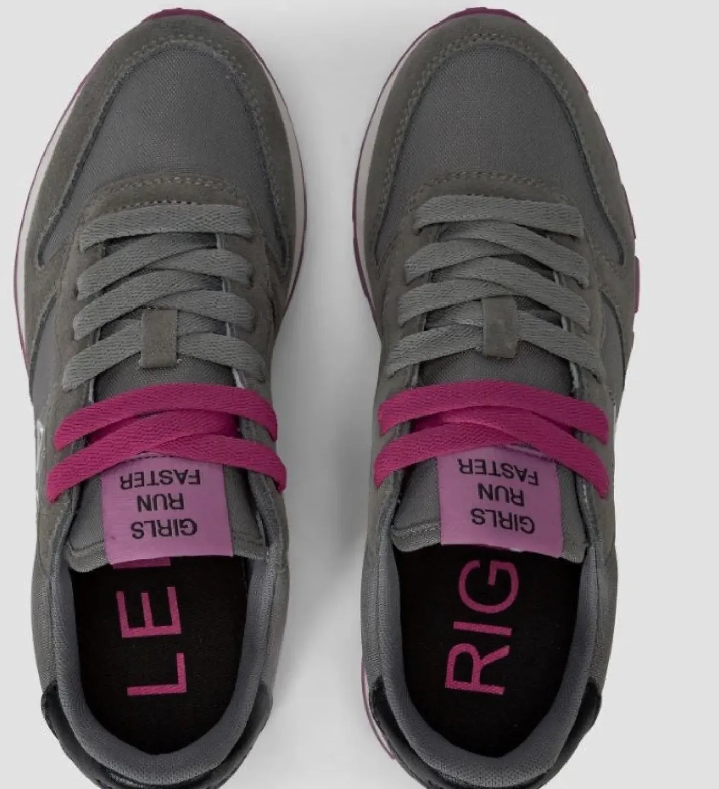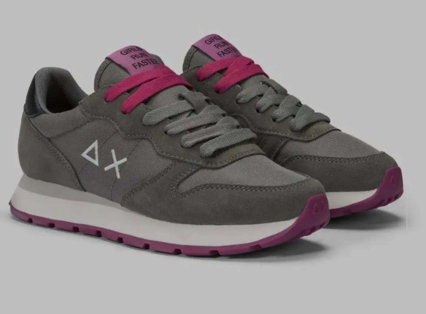 Sneakers in camoscio e tessuto. Logo bianco sul lato. Chiusura con lacci, fondo in gomma bicolor. Spoiler nero. Lacci cotone grigio e fuxia.