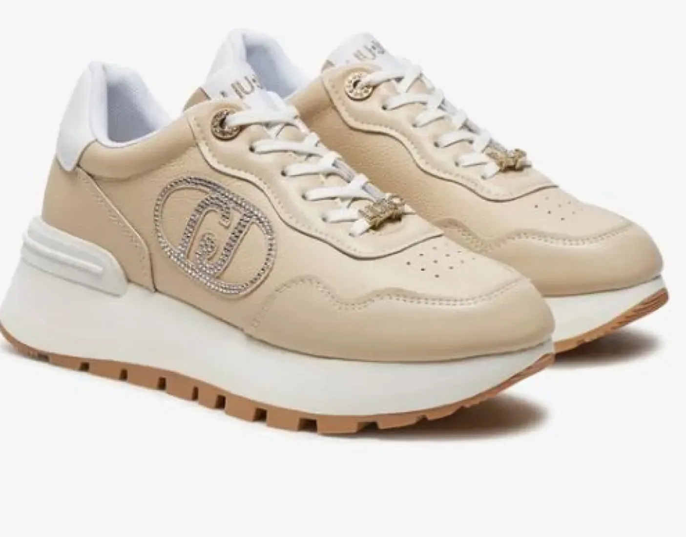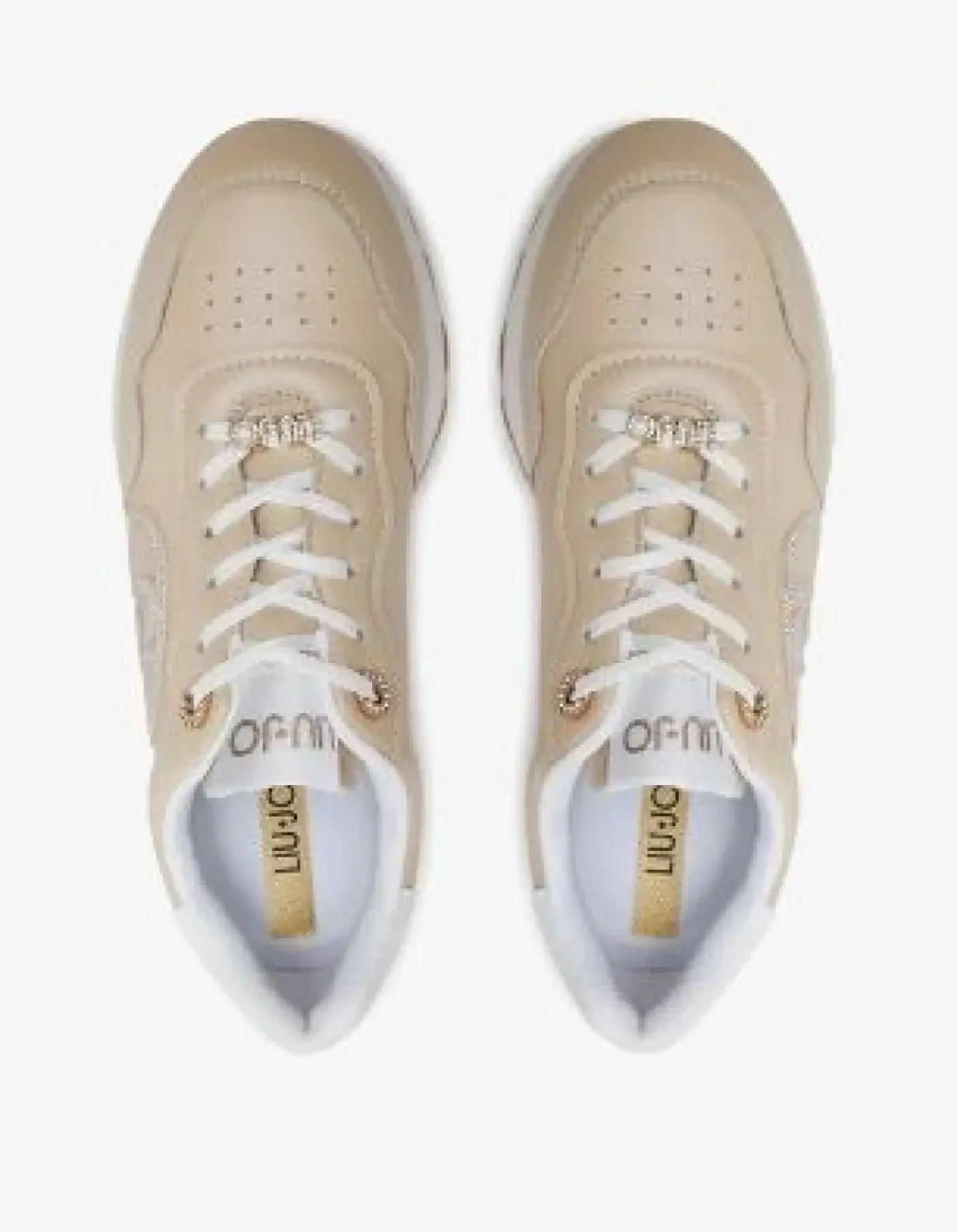 Sneakers in pelle con inserti glitter. Logo laterale maxi. Chiusura con lacci, applicazione metallica asportabile. Fondo gomma bicolor 5cm.