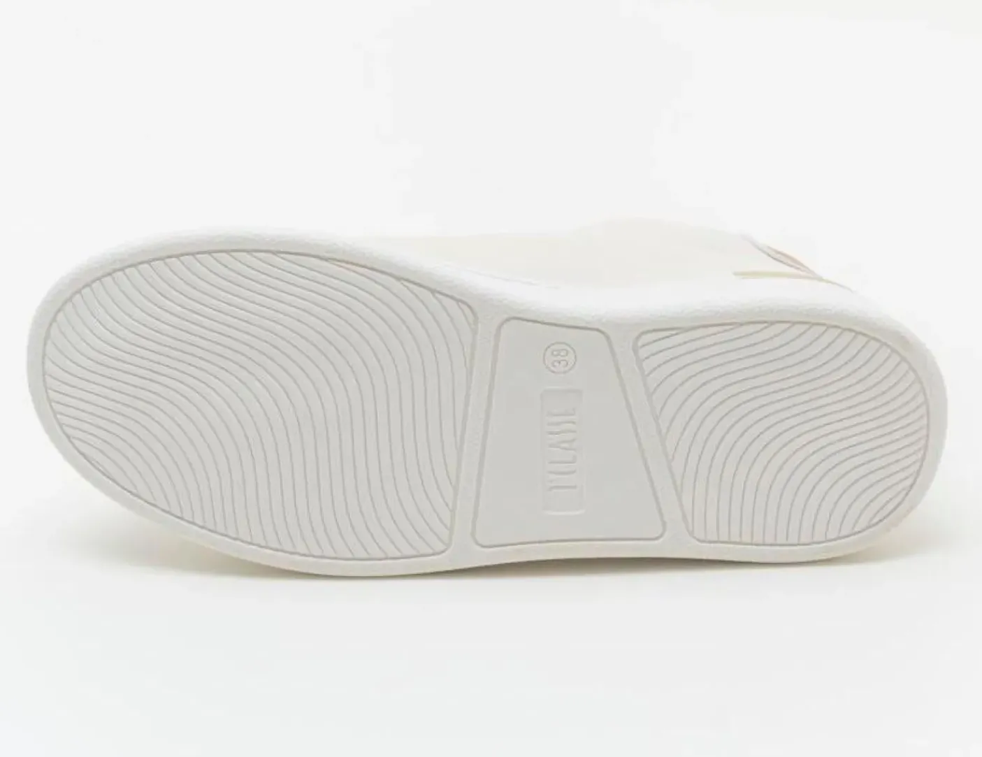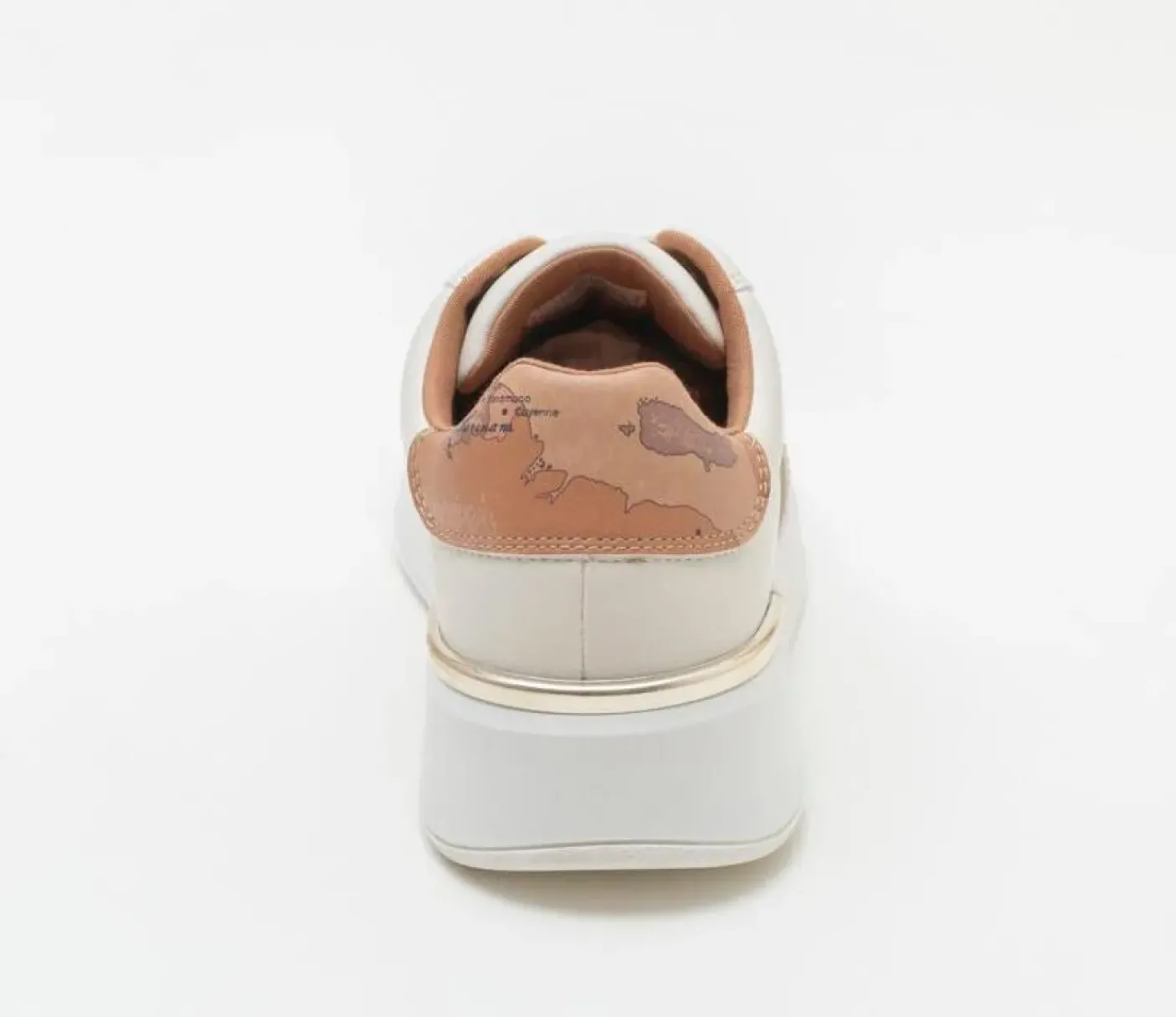 Sneakers 1° Classe in ecopelle, inserti in pelle. Stampa geo spoiler, applicazione metallica catena laterale oro. Sottopiede estraibile. Fondo in gomma 4 cm con applicazione metallica. Chiusura con lacci neri.