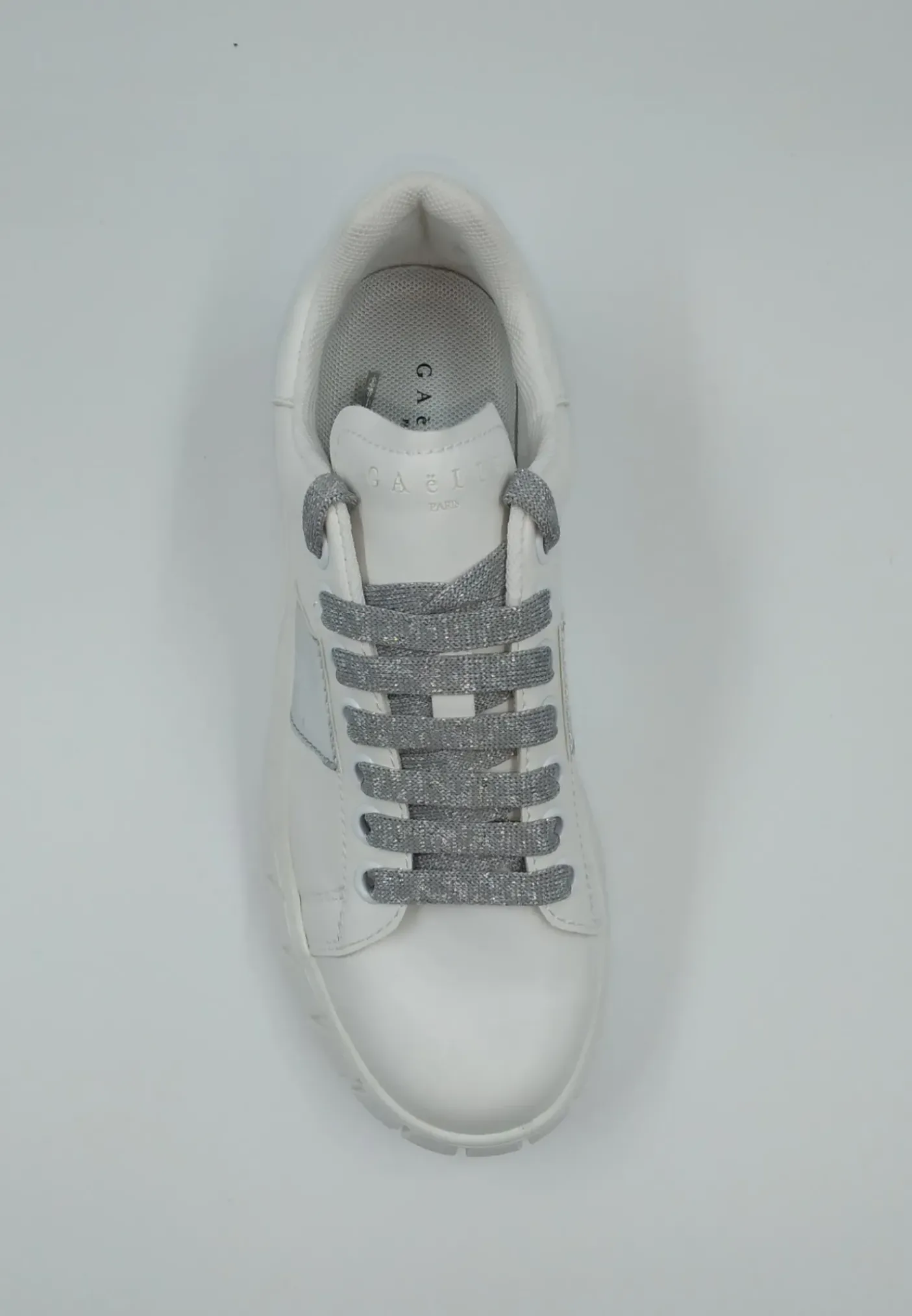 Sneakers in ecopelle con striscia argento. Chiusura con lacci laminati argento. Fondo in gomma.
