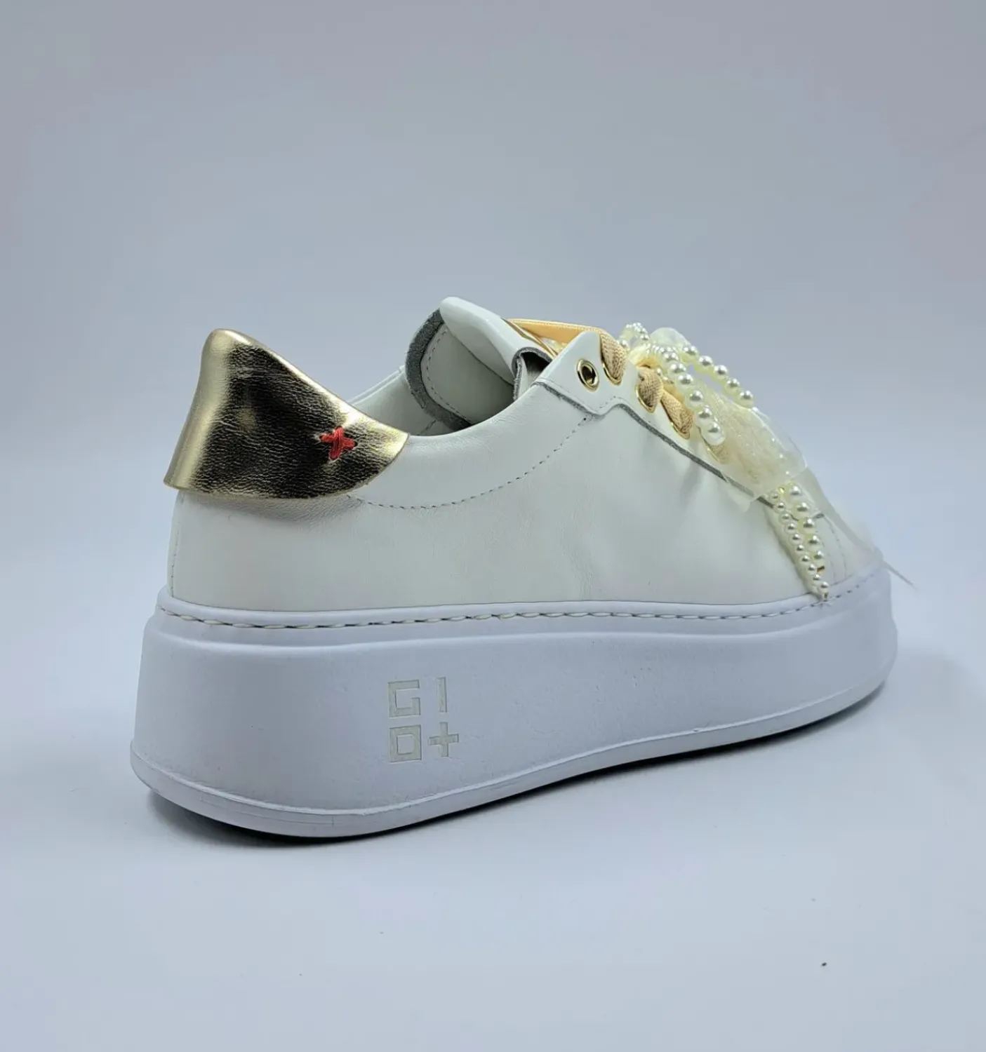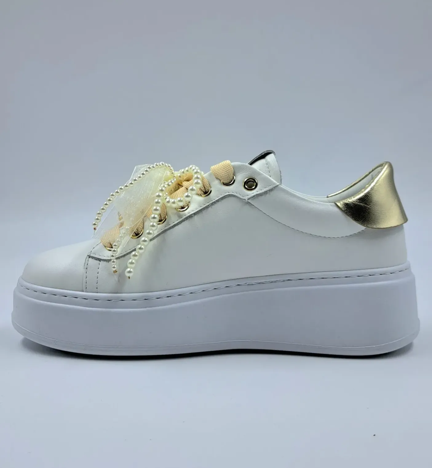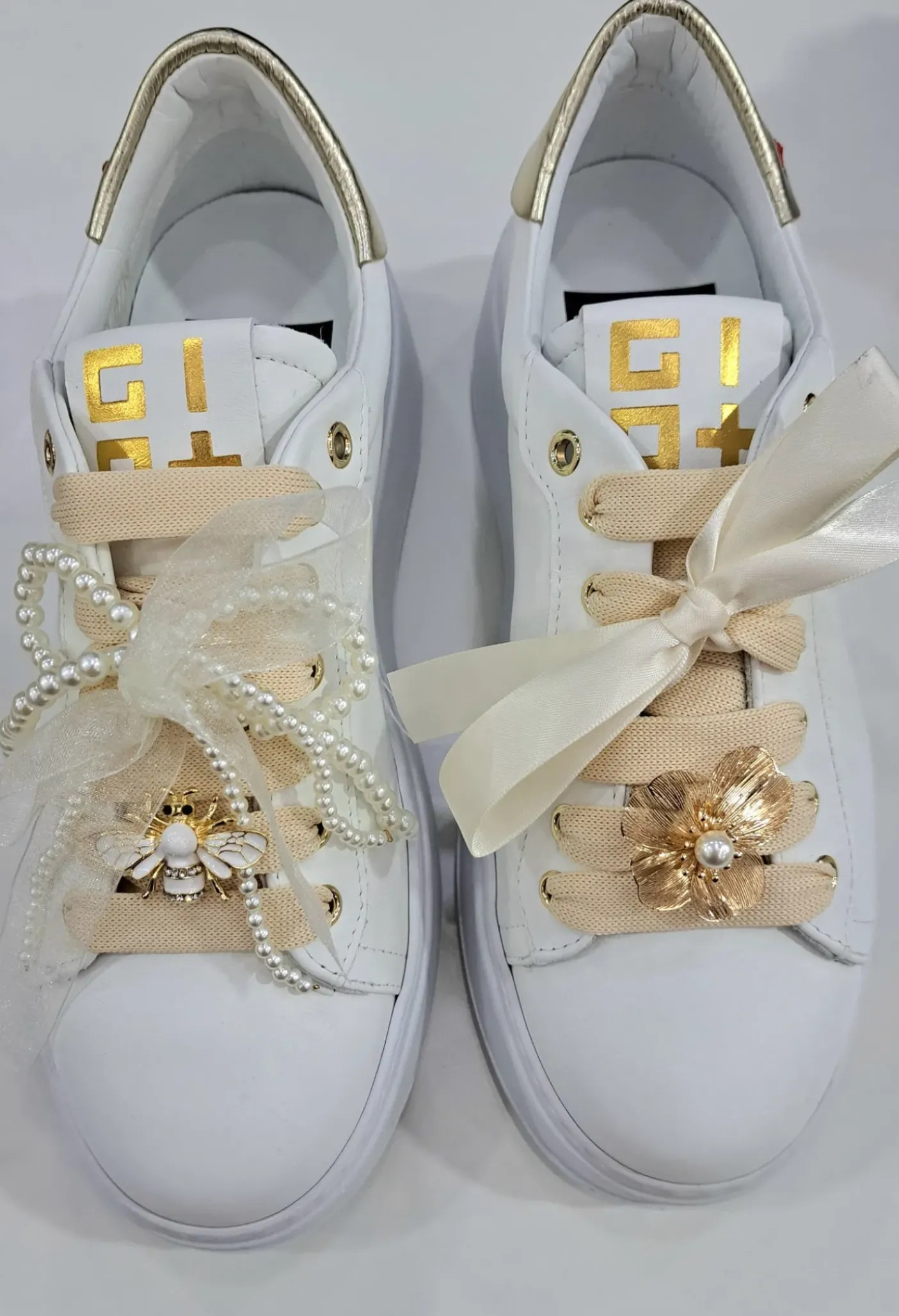 Sneakers in pelle, rivestita internamente in pelle. Dettagli spoiler gold. Charms asportabili ape smaltata fiocchi raso, perle e fiore gold. Chiusura con lacci. Fondo gomma5cm.