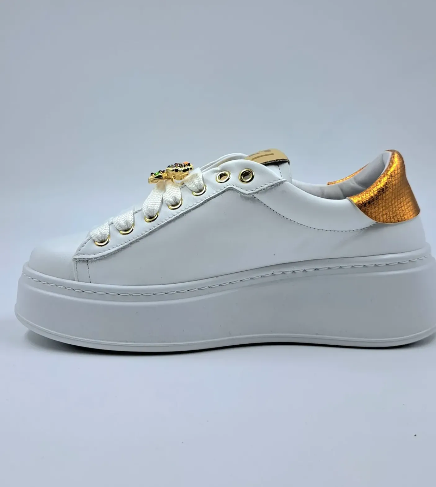 Sneakers in pelle, rivestita internamente in pelle. Dettagli spoiler arancio pelle lux. Charms asportabili Farfalla strass e pietre quadrate strass. Chiusura con lacci. Fondo gomma5cm.