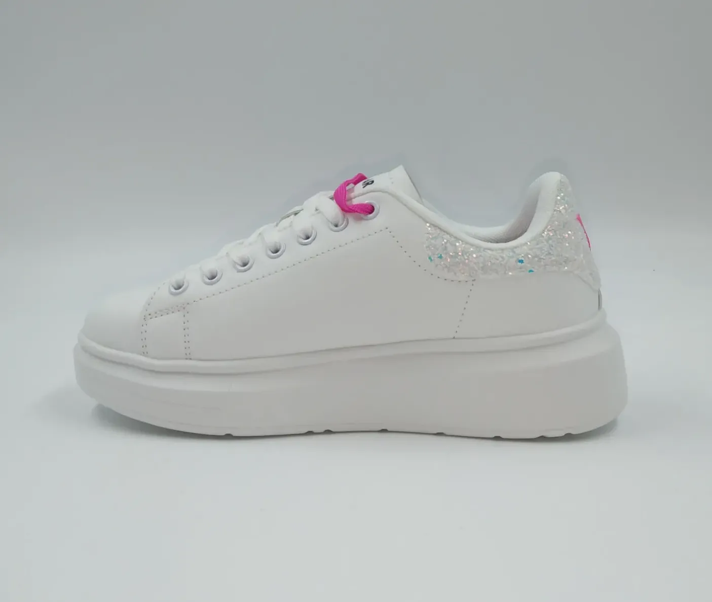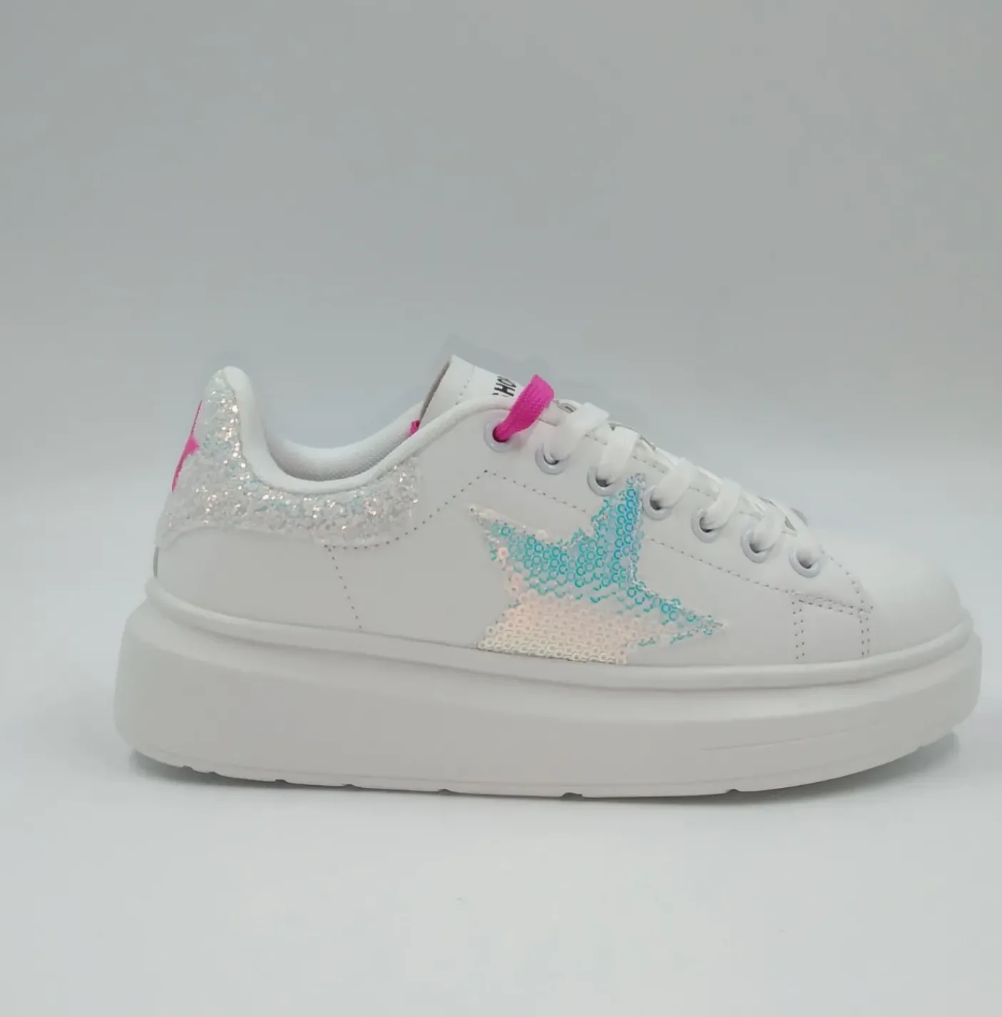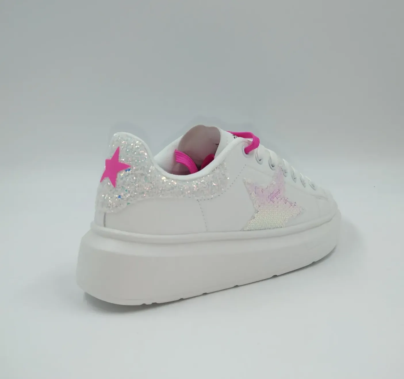 Sneakers con decorazione stella paillettes e applicazione glitter sul retro. Chiusura con lacci bianchi e fuxia. Fondo gomma.