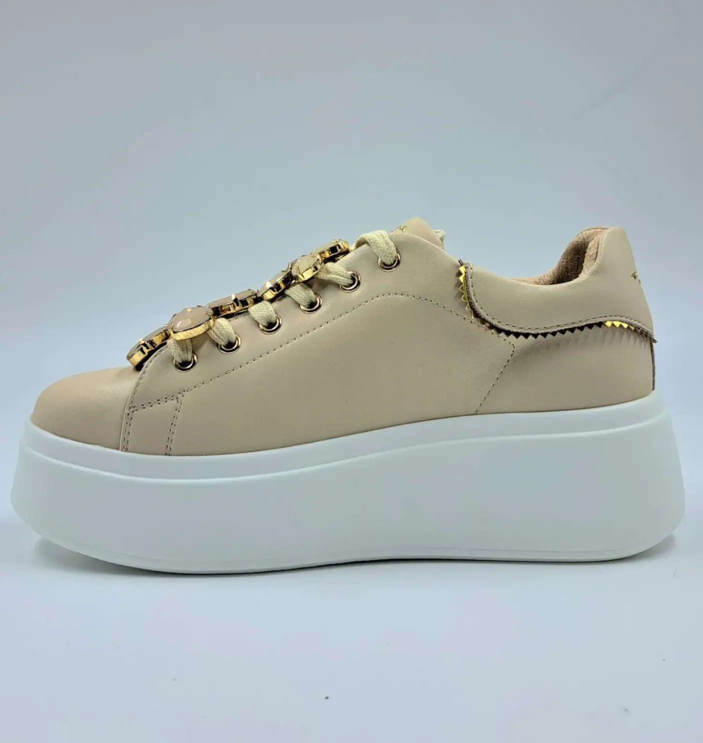 Sneakers in vera pelle, rivestita internamente in pelle. Charms asportabile maxi fiori pietre beige e nude. Dettagli gold. Chiusura con lacci. Fondo gomma 5cm.