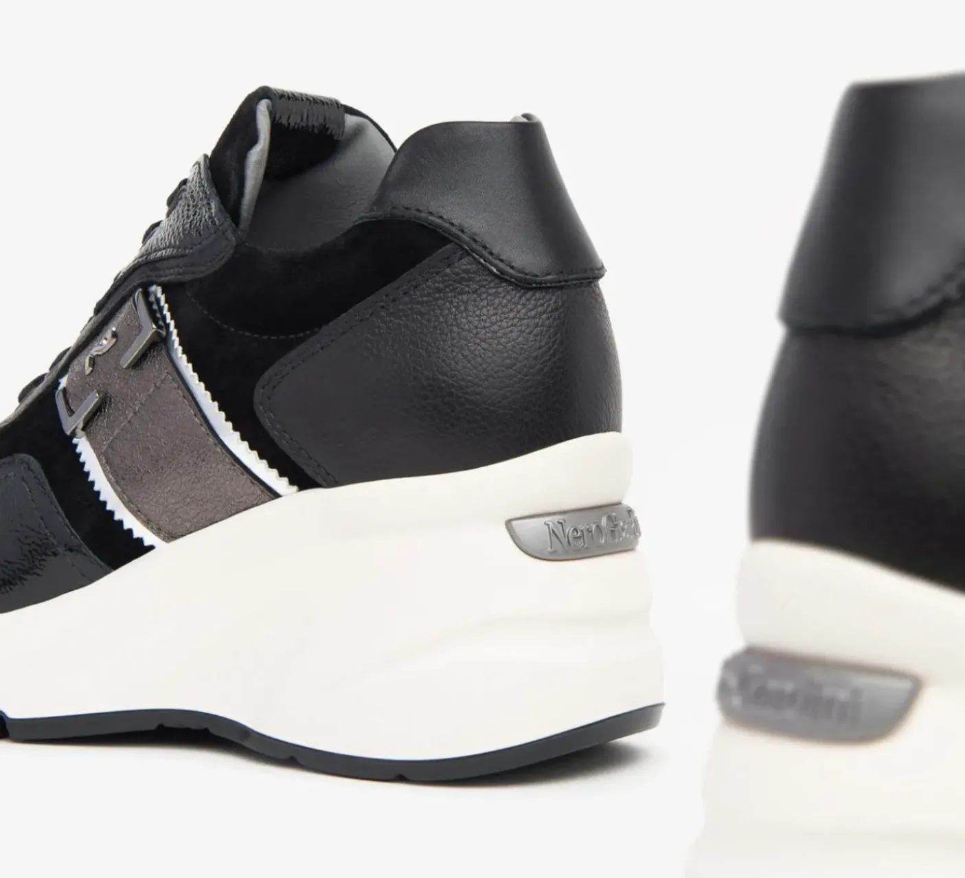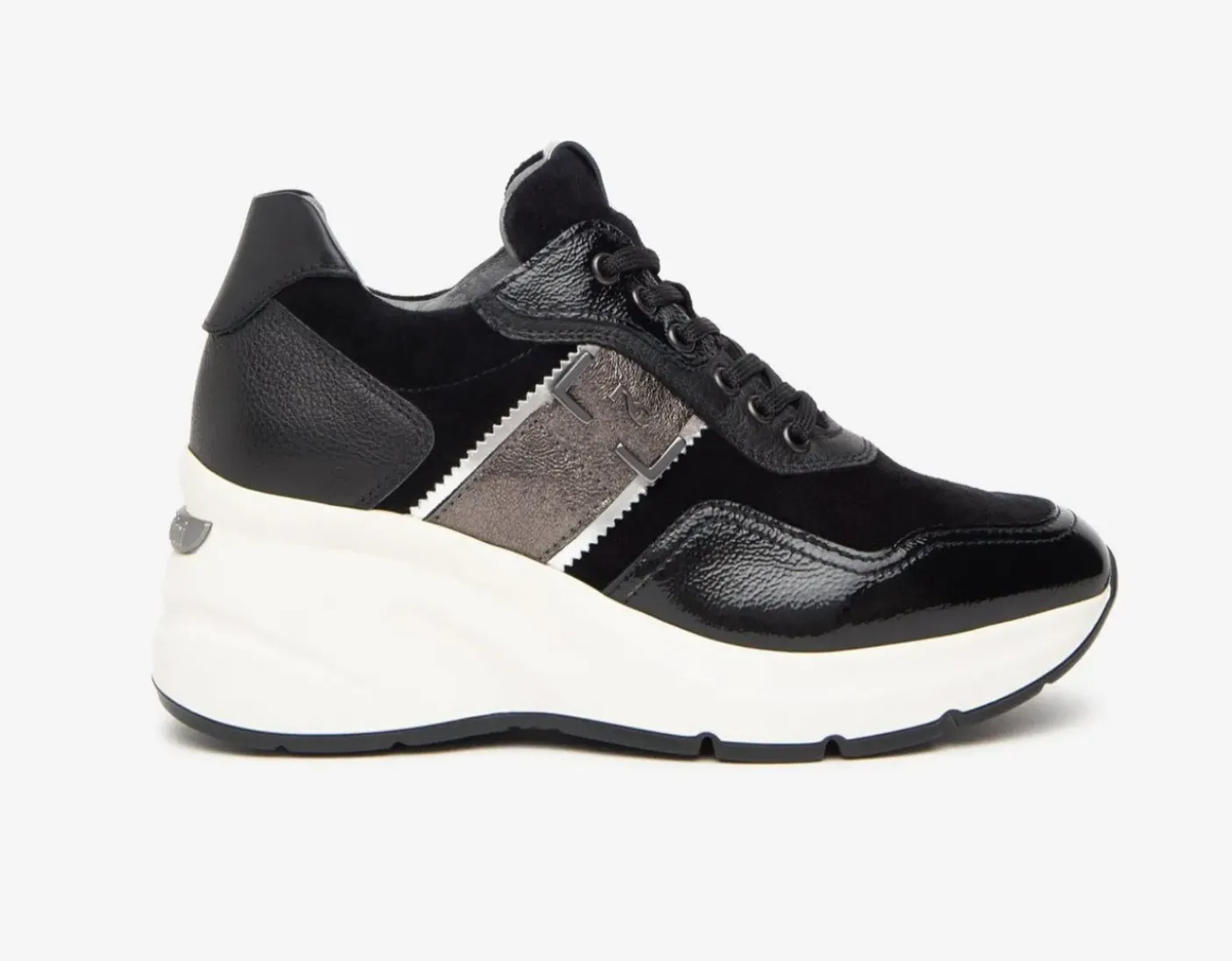 Sneakers in vera pelle camoscio e materiale tecnico. Applicazione fascia logata a contrasto logo metallico. Rivestita internamente in pelle. Sottopiede con tecnologia DryGo!®. Soletta estraibile. Fondo gomma zeppa 6cm
