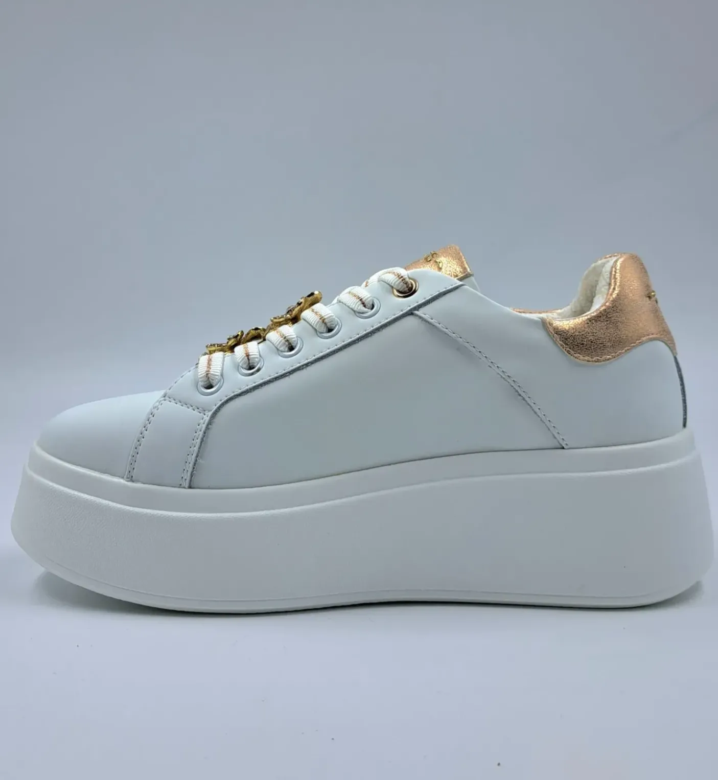 Sneakers in vera pelle, rivestita internamente in pelle. Charms asportabile fiori strass cipria e bianchi. Spoiler pelle cipria lux. Chiusura con lacci. Fondo gomma 5cm.