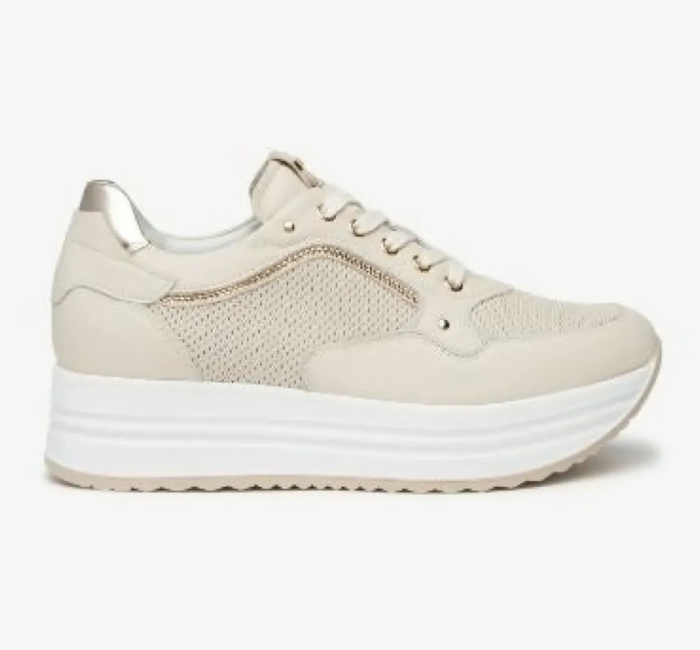 Sneakers in pelle dettagli silver. Striscia decorativa microstrass. Chiusura con lacci. Rivestita internamente in pelle. Soletta in pelle. Tecnologia DryGo! Fondo gomma platform 4,5 cm.