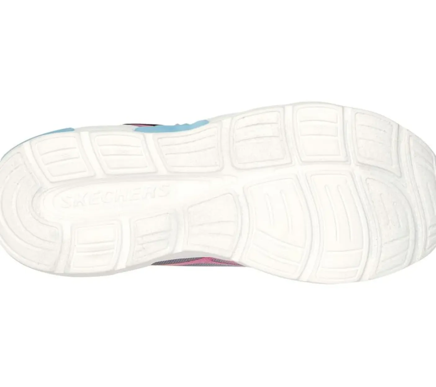 Skechers Rainbow Racer con decorazioni luminose. Tomaia in materiale tecnico e mesh glitterato con allacciatura frontale elasticizzata, soletta Air Cooled Memory Foam® ammortizzata, grafica arcobaleno e chiusura con cinturino a strappo.