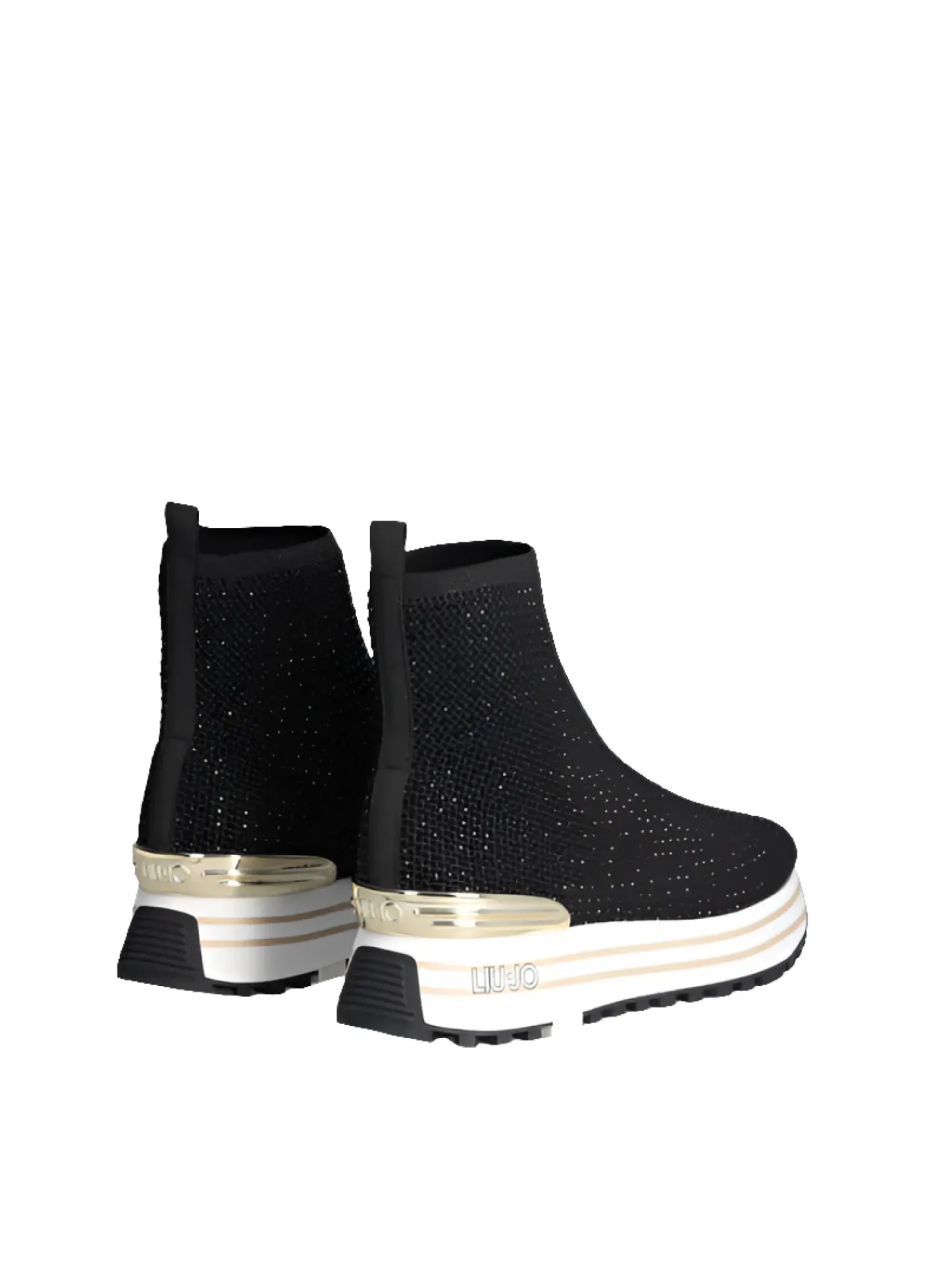Sneakers in tessuto elasticizzato con micro strass neri, spoiler effetto metallizzato oro. Fondo platform con logo stampato, battistrada dentellato in gomma.