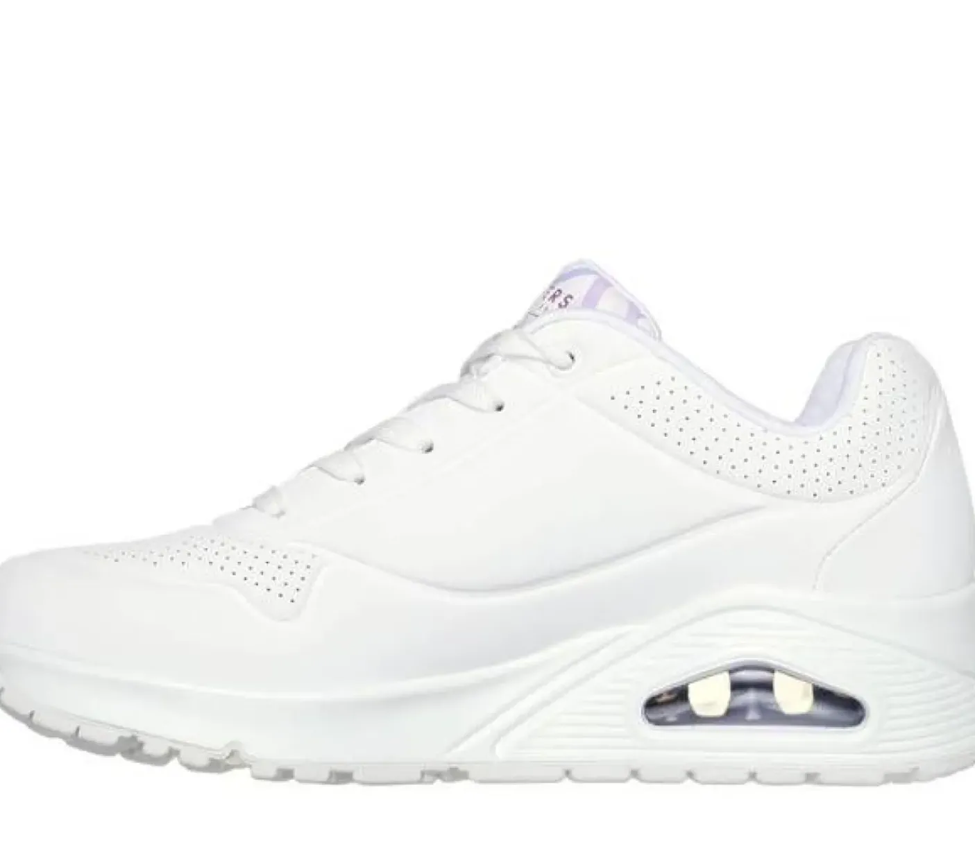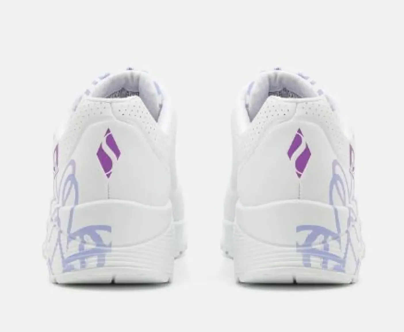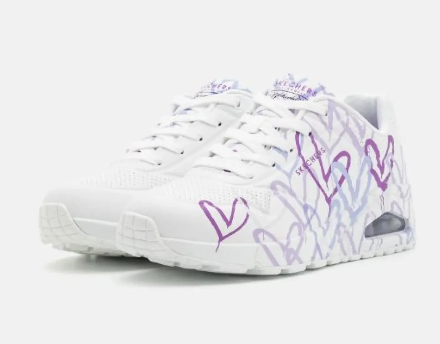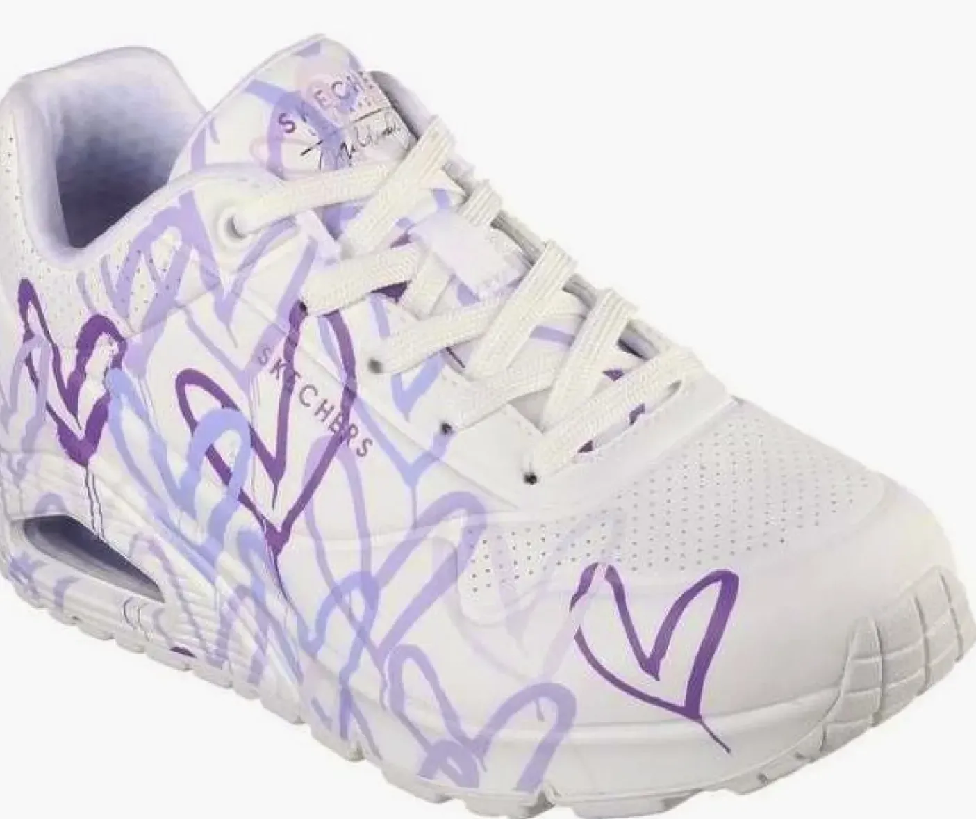 Sneakers ultra leggera in durabuck tecnico traforata decorazione cuori lavanda e porpora, sottopiede in memory foam e air cooled. Intersuola ammortizzata ad aria con tecnologia visibile Skech-Air®. Fondo in gomma 3 cm e chiusura con lacci.