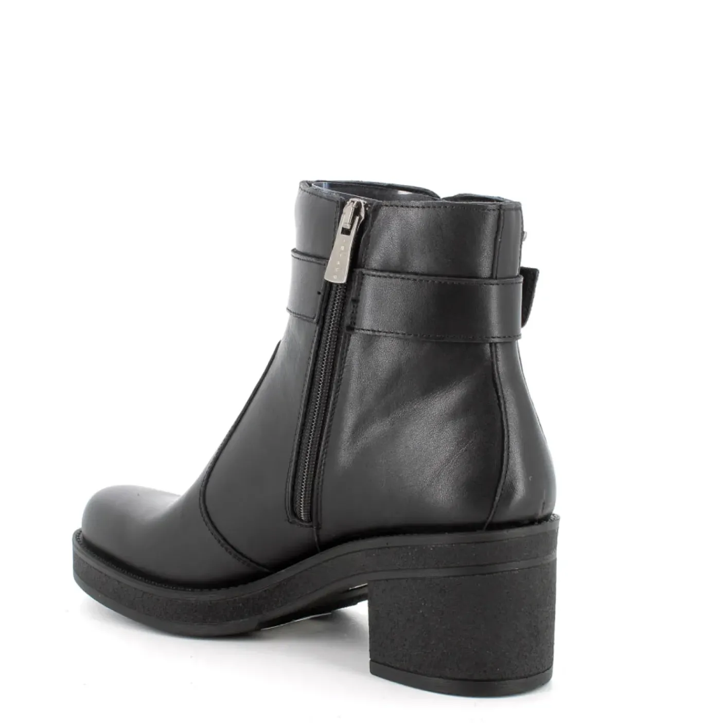 Stivaletti in vera pelle morbida. Rivestito internamente in caldo tessuto e pelle. Fibbia laterale decorativa. Chiusura con zip. Fondo gomma tacco7cm.