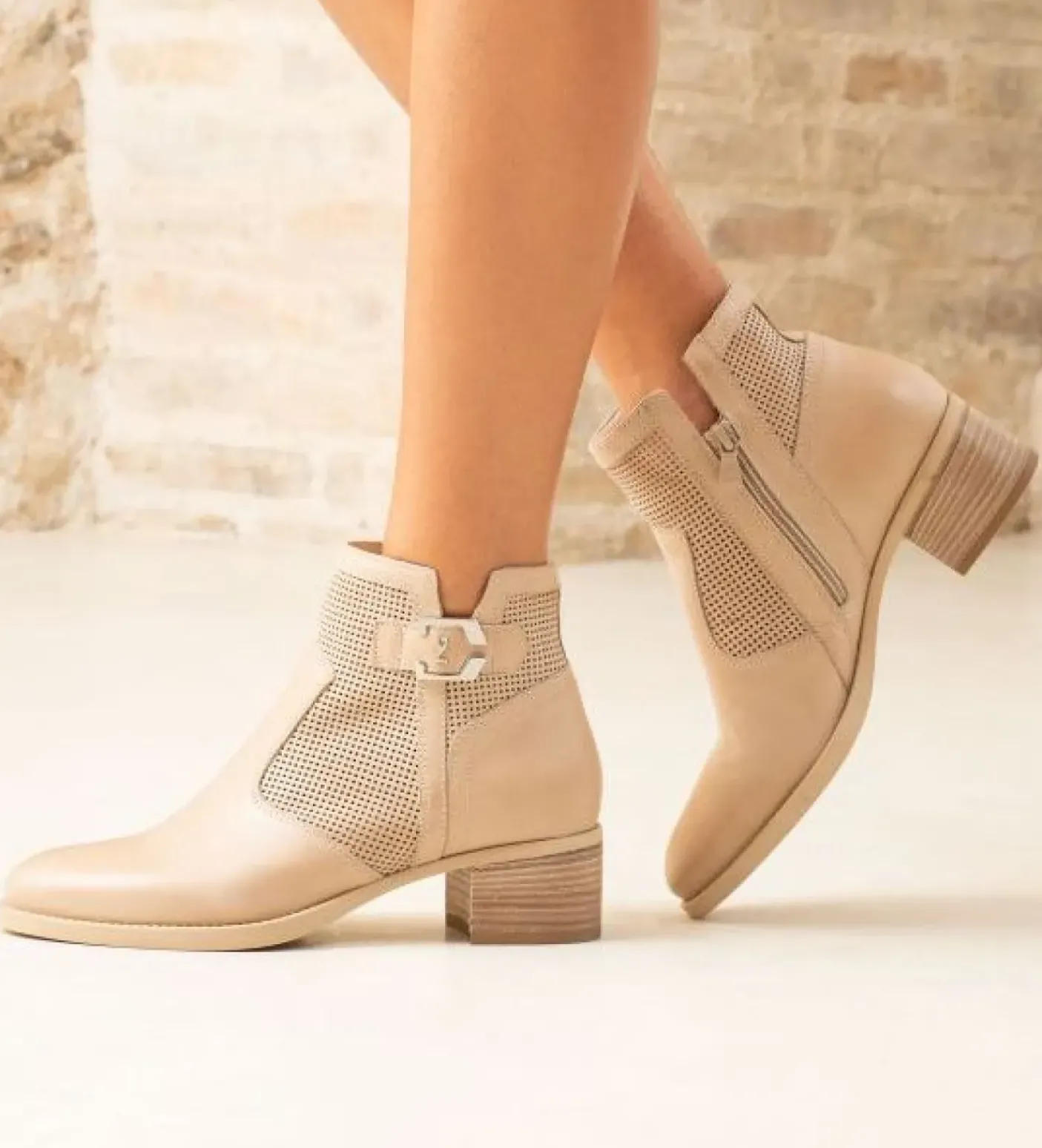Stivaletti in pelle e pelle traforata. Chiusura laterale con zip. Rivestito internamente in pelle. Tacco 4cm. Logo metallico laterale.